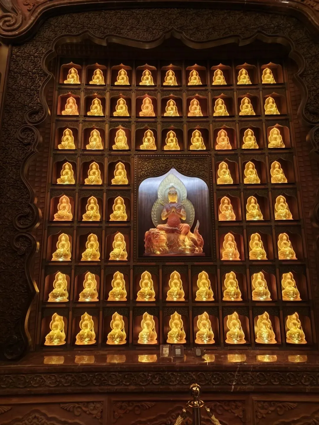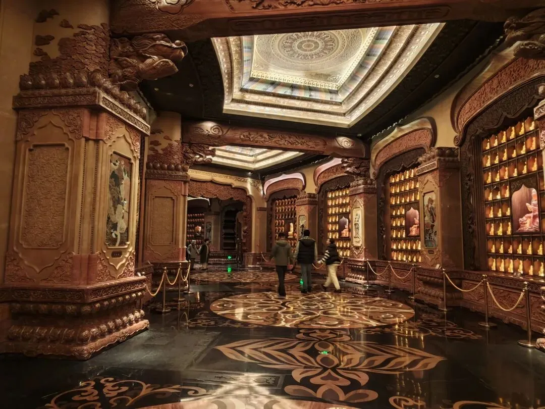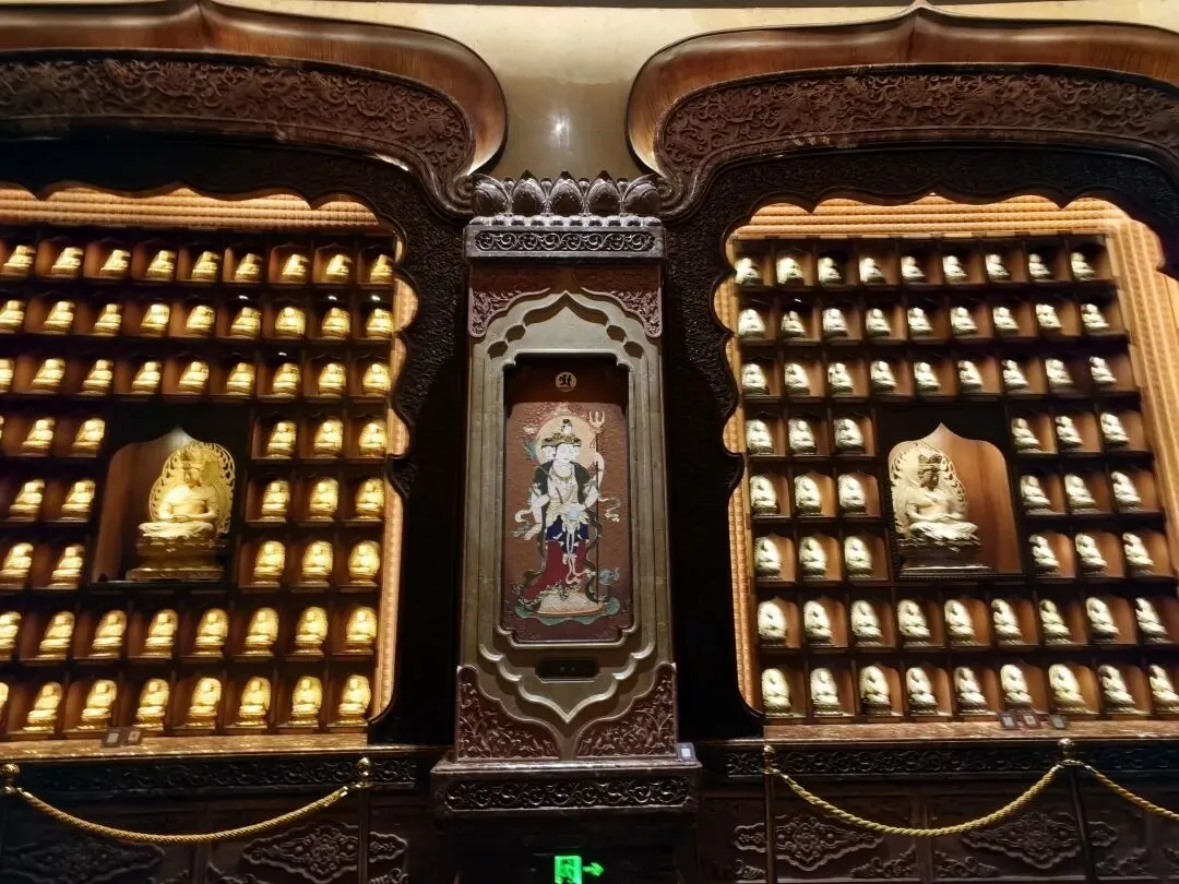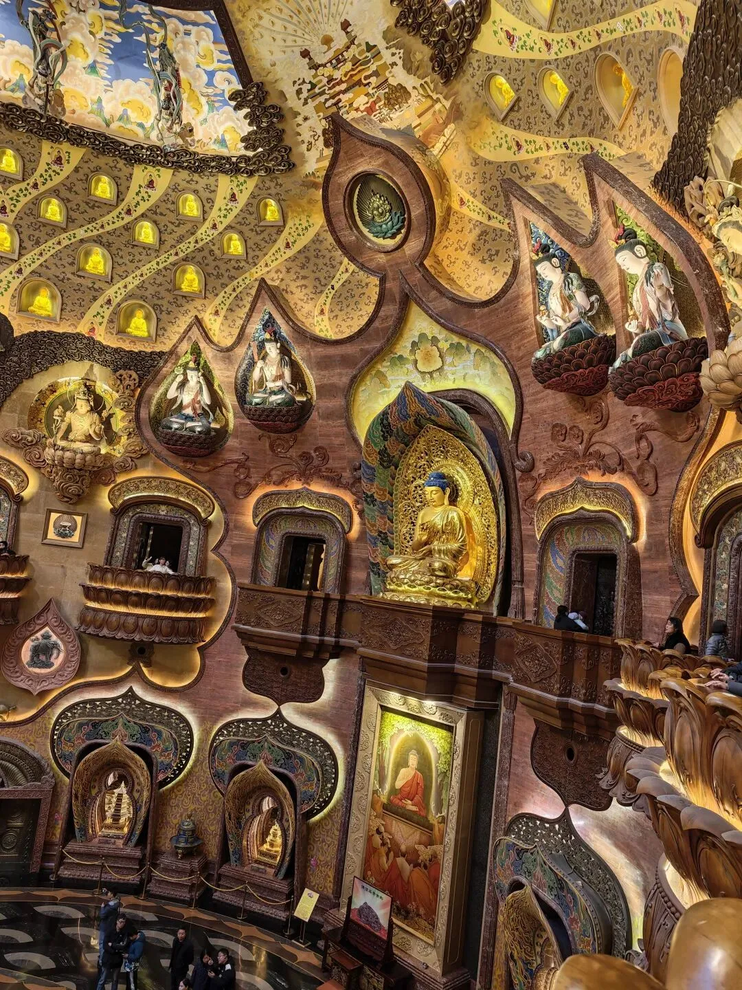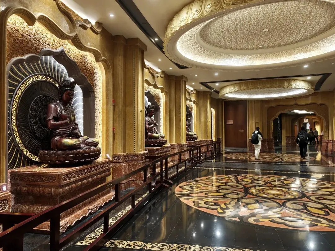 来到位于地下最深处的千佛殿,进入大厅,立刻被金碧辉煌,奢华至极的场面所震慑,仿若一步跨入了一座艺术殿堂中。眼前的一切实在是美的不可方物,眼花缭乱,一时竟不知先从哪看起才好。所有的空间都布满着各种艺术形式的佛教元素。这里是色彩的海洋,这里是艺术的圣殿。