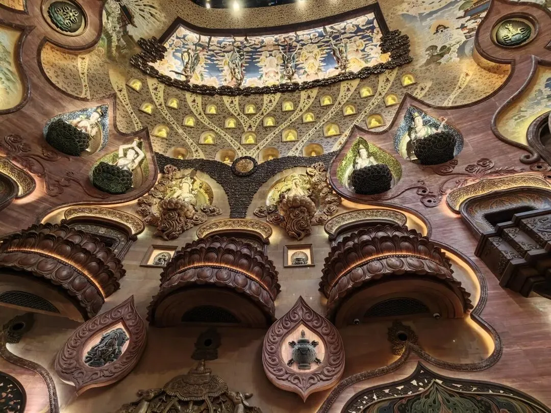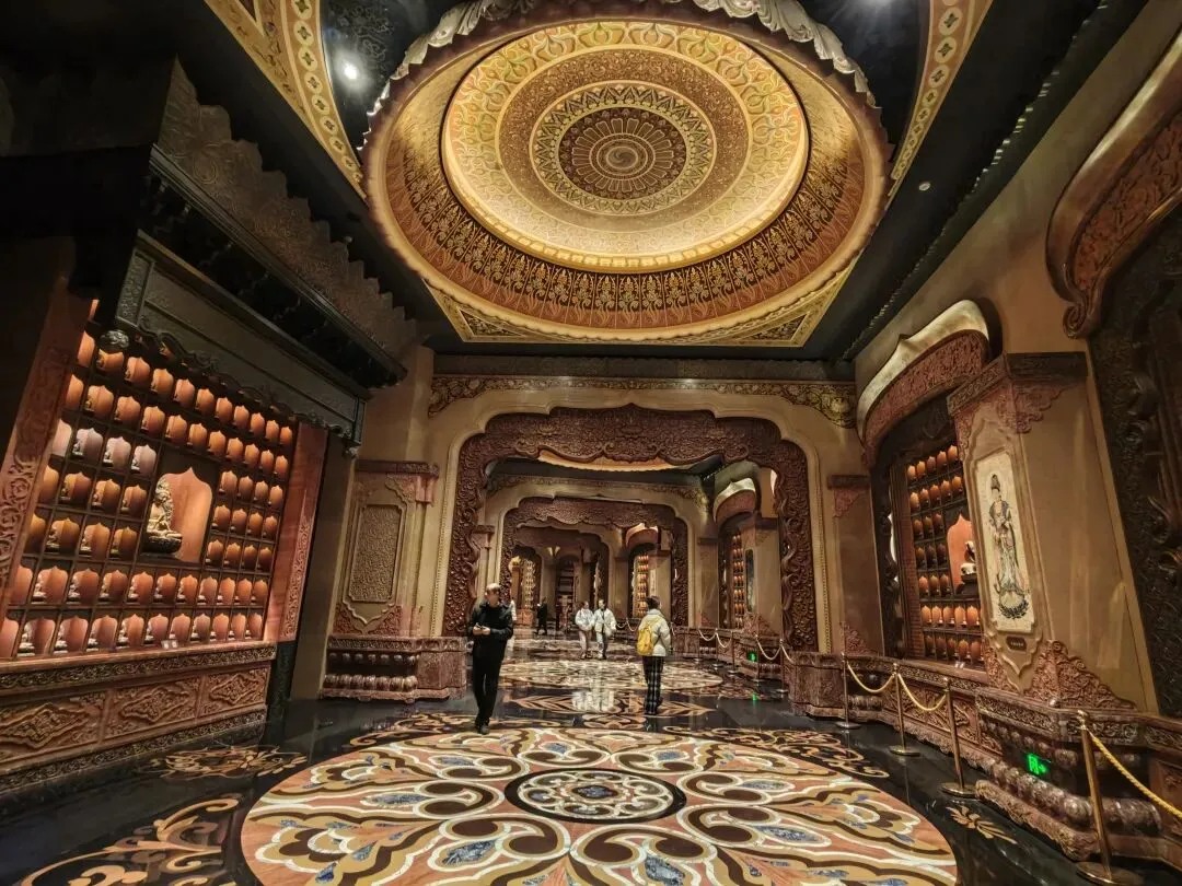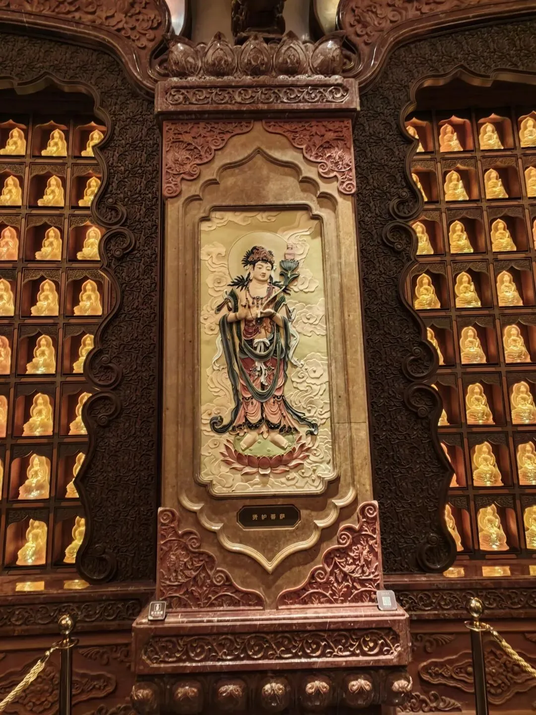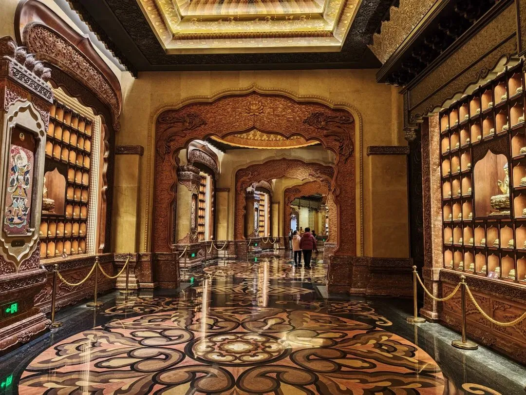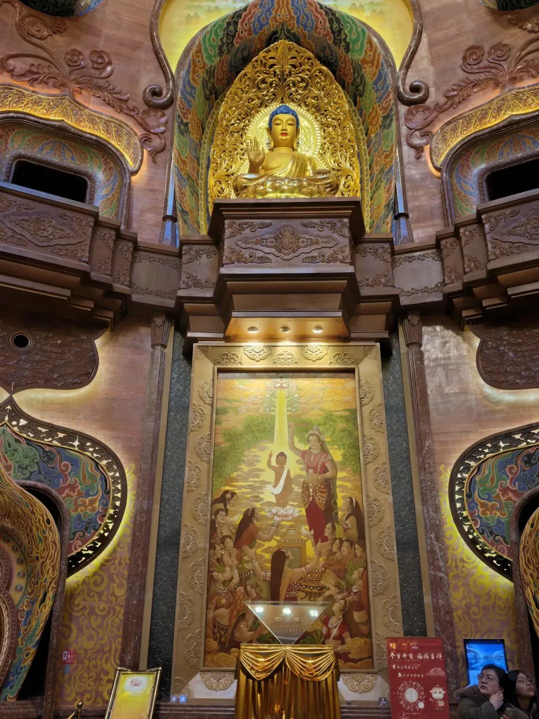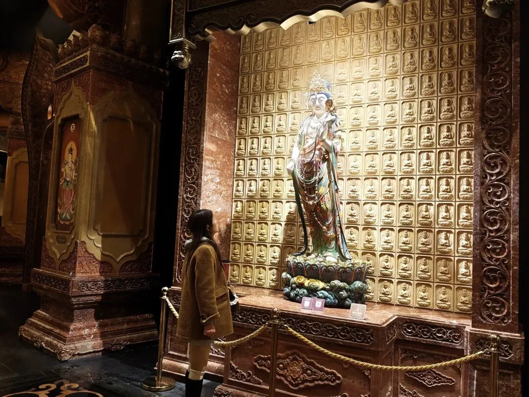 来到位于地下最深处的千佛殿,进入大厅,立刻被金碧辉煌,奢华至极的场面所震慑,仿若一步跨入了一座艺术殿堂中。眼前的一切实在是美的不可方物,眼花缭乱,一时竟不知先从哪看起才好。所有的空间都布满着各种艺术形式的佛教元素。这里是色彩的海洋,这里是艺术的圣殿。