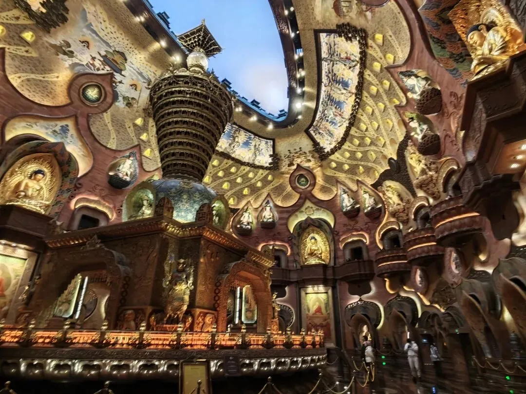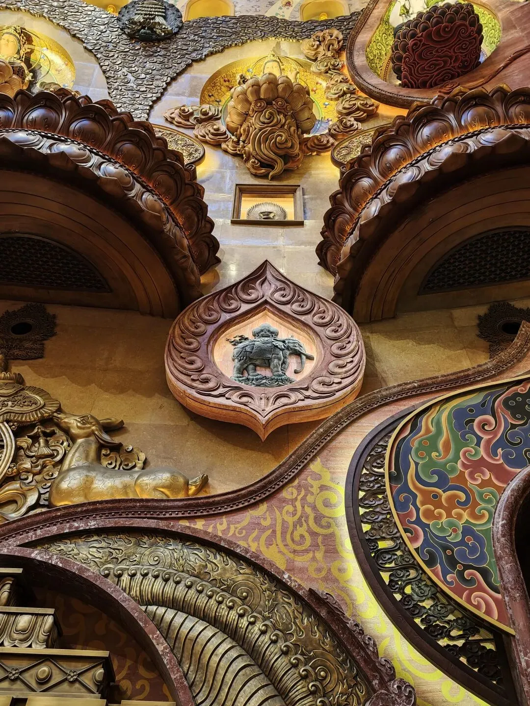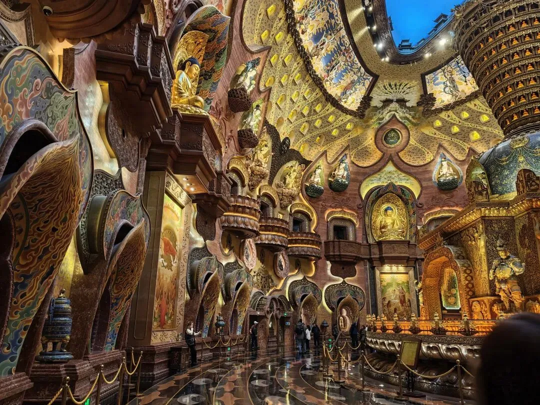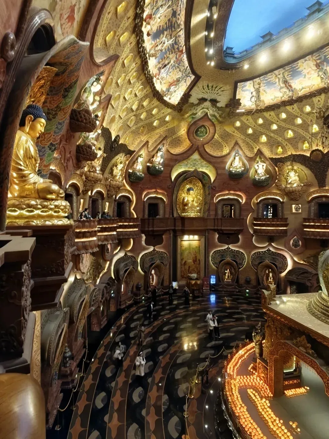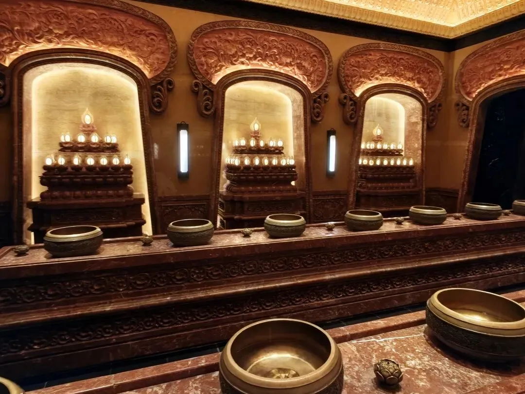 来到位于地下最深处的千佛殿,进入大厅,立刻被金碧辉煌,奢华至极的场面所震慑,仿若一步跨入了一座艺术殿堂中。眼前的一切实在是美的不可方物,眼花缭乱,一时竟不知先从哪看起才好。所有的空间都布满着各种艺术形式的佛教元素。这里是色彩的海洋,这里是艺术的圣殿。