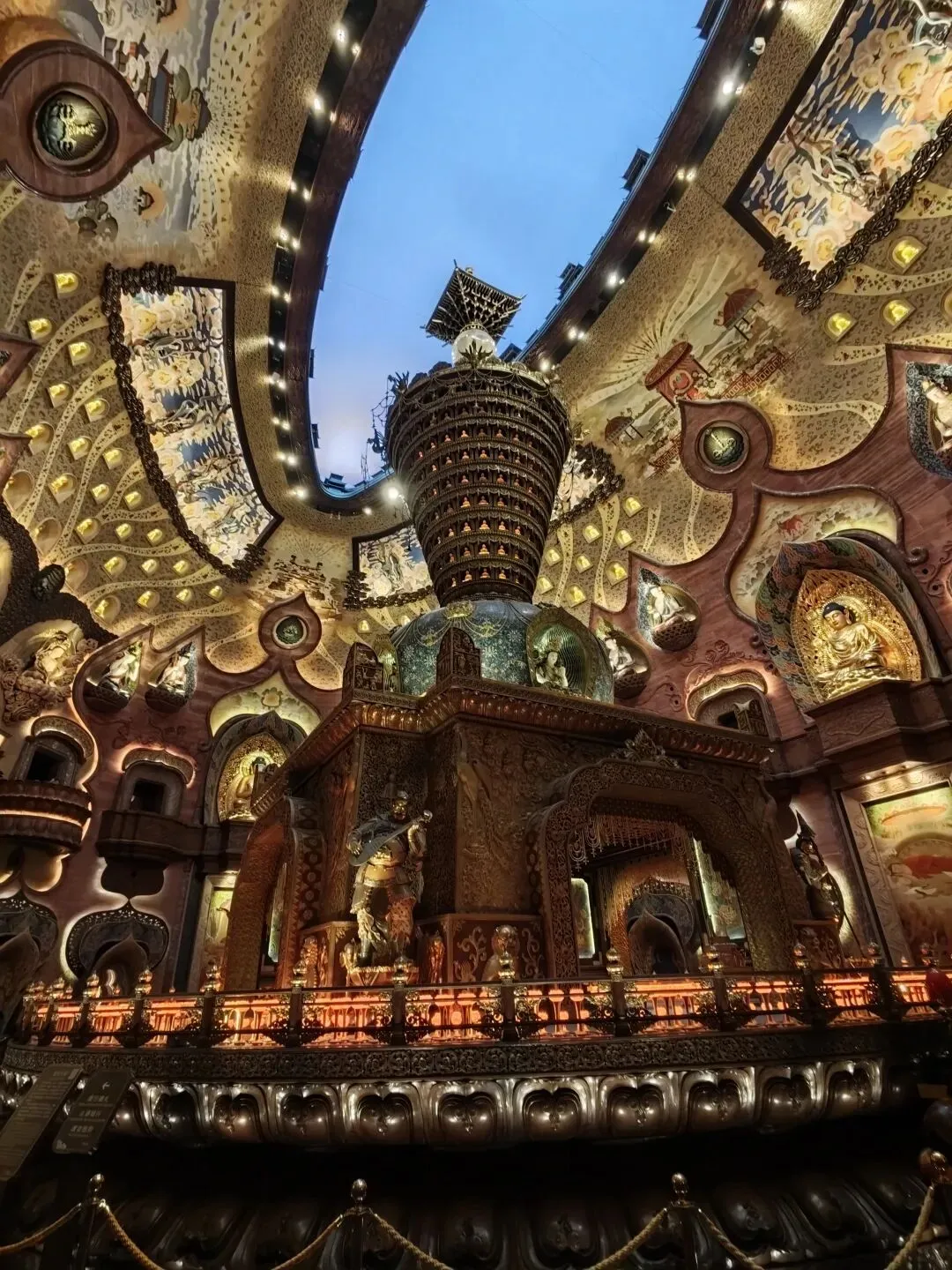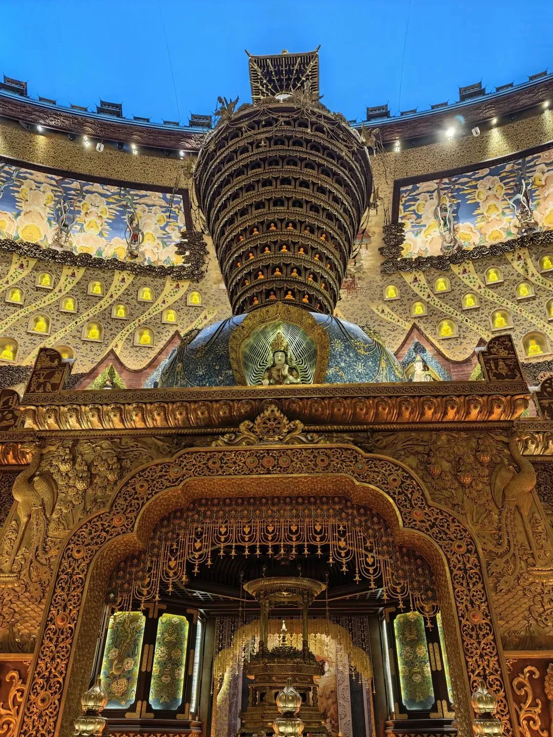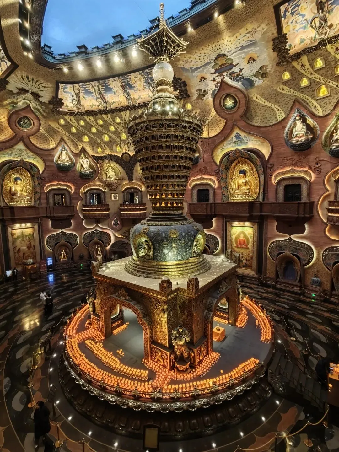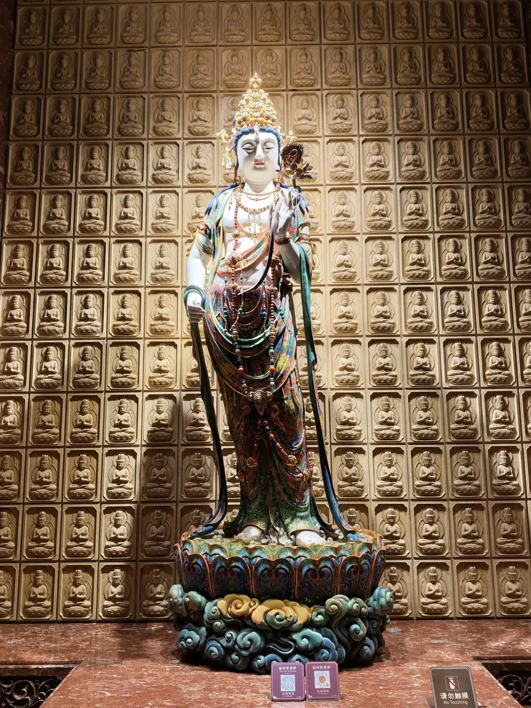 来到位于地下最深处的千佛殿,进入大厅,立刻被金碧辉煌,奢华至极的场面所震慑,仿若一步跨入了一座艺术殿堂中。眼前的一切实在是美的不可方物,眼花缭乱,一时竟不知先从哪看起才好。所有的空间都布满着各种艺术形式的佛教元素。这里是色彩的海洋,这里是艺术的圣殿。
