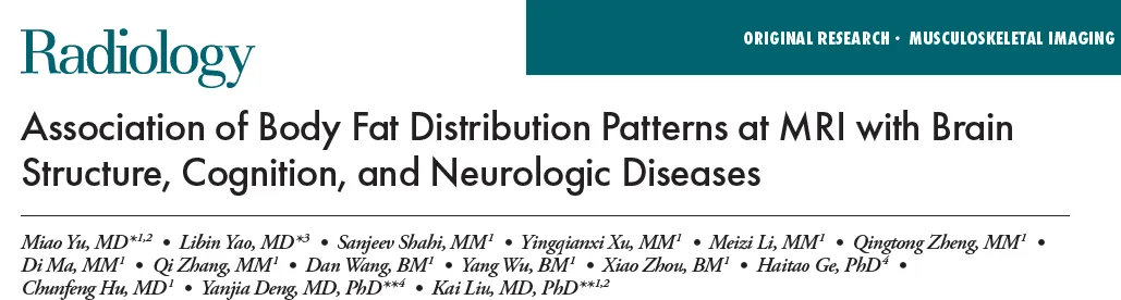 本次分享的文献来自由徐州医科大学附属医院放射科团队近日(2026年1月27日)在最新一期中科院1区top、放射影像学顶刊《Radiology》(IF=15.2)上发表的研究 “Association of Body Fat Distribution Patterns at MRI with Brain Structure, Cognition, and Neurologic Diseases”,MRI中体脂分布模式与脑结构、认知及神经疾病的关联脂肪分布模式与大脑结构的关联研究