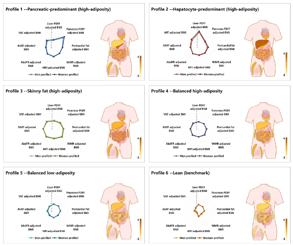 - Profile 1(胰腺主导型):胰腺质子密度脂肪分数(PDFF)显著升高(男性z=2.38,女性z=3.01)。