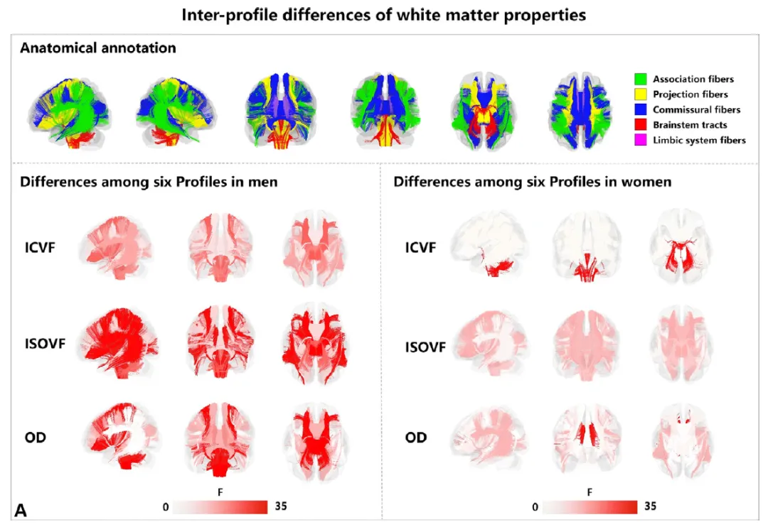- 白质微观结构:男性Profile 1-3显示神经突密度降低(ICVF下降)和细胞外自由水增加(ISOVF升高),女性差异不显著。