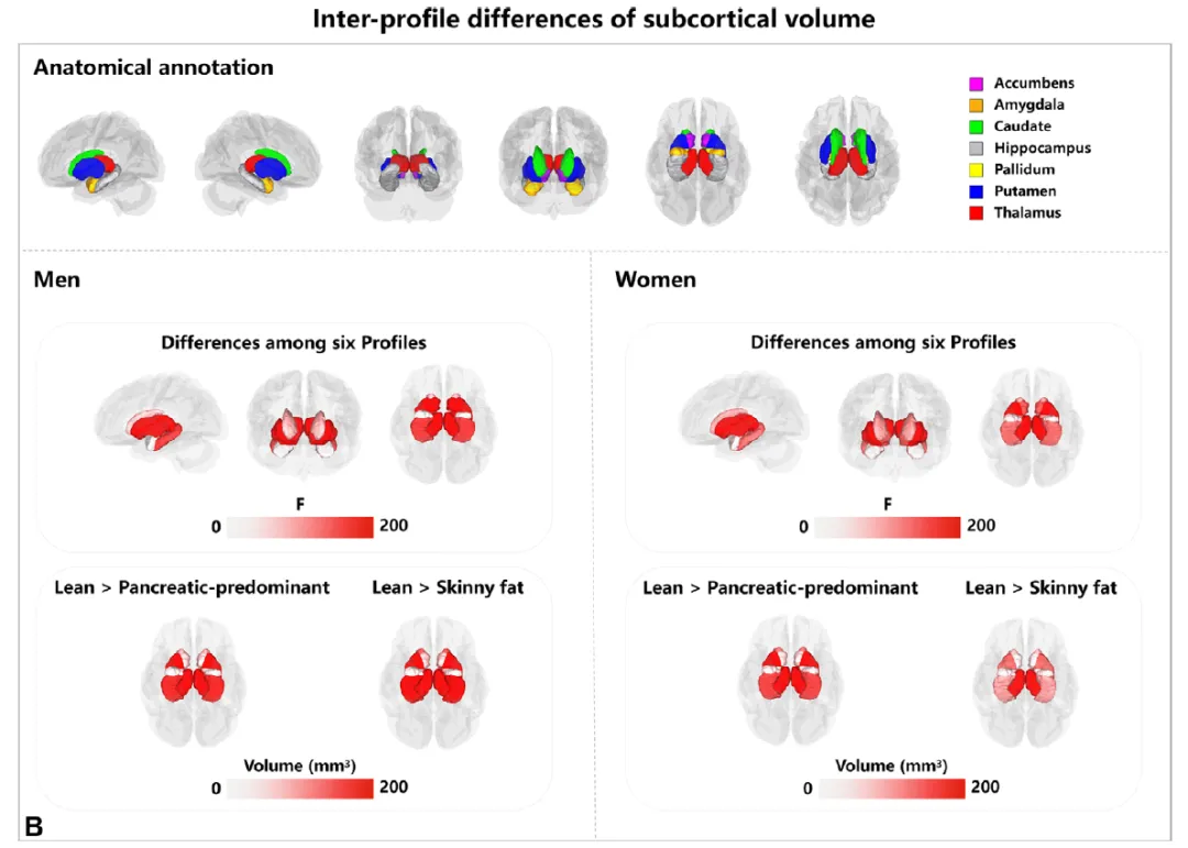 - 脑体积萎缩:与Profile 6相比,高肥胖模式(Profile 1-4)均显示全脑体积、灰质体积显著降低(Cohen d范围:男性-0.63至-0.12,女性-0.58至-0.11)。Profile 1(胰腺主导型)和Profile 3(瘦胖子型)的灰质萎缩最严重(男性Cohen d=-0.63和-0.56;女性=-0.58和-0.12)。