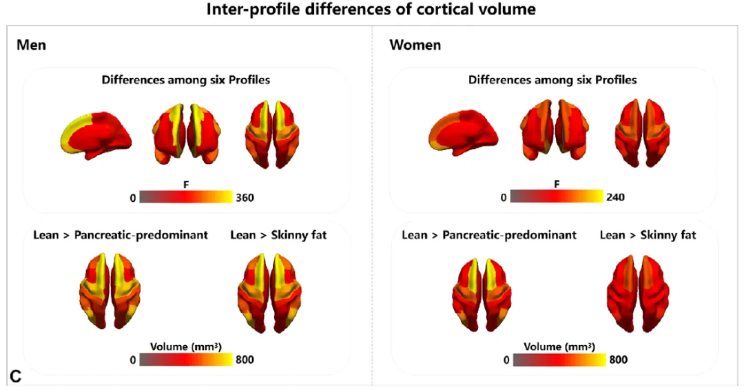 Figure 3:组间比较揭示六种脂肪分布模式在(A)脑白质特性、(B)皮层下体积和(C)皮层体积方面的差异。