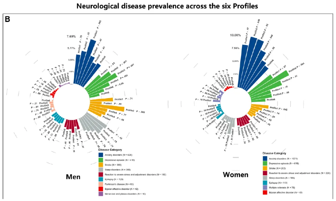 - 情绪障碍:Profile 1和3在男女群体中均与焦虑、抑郁风险升高相关(男性OR=1.73-3.32;女性OR=1.48-2.12)。
