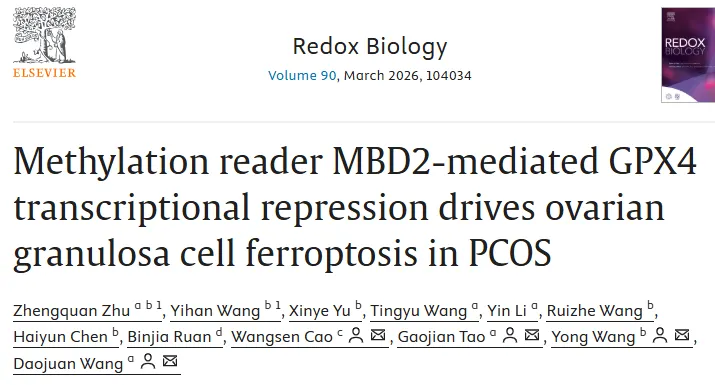 近日,南京大学医学院王勇教授团队在Redox Biology杂志发表了题为“Methylation reader MBD2-mediated GPX4 transcriptional repression drives ovarian granulosa cell ferroptosis in PCOS”的论文,该研究揭示了甲基“阅读”蛋白MBD2促进Gpx4转录抑制是PCOS颗粒细胞铁死亡和卵巢病变的重要表观遗传学旁路。