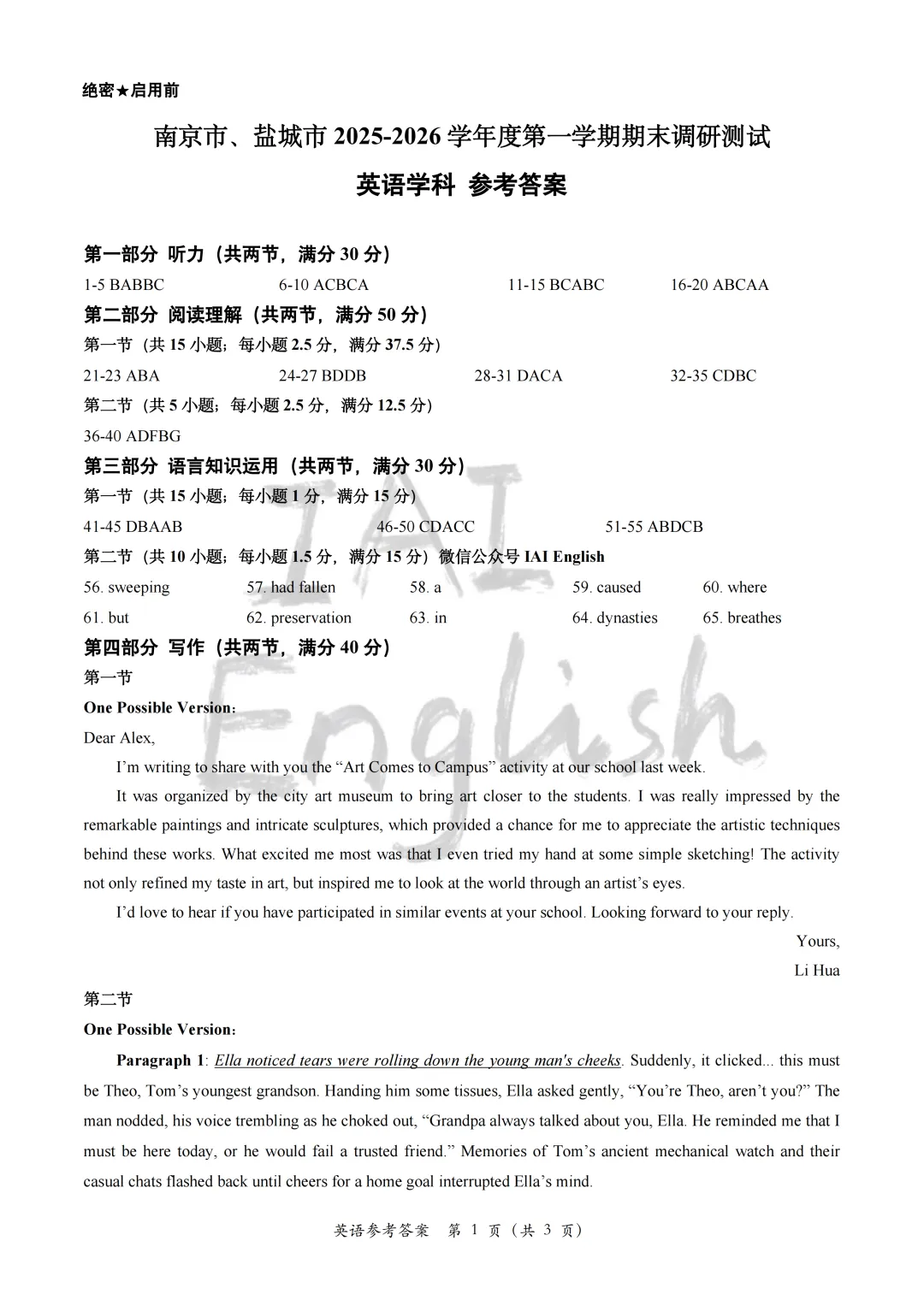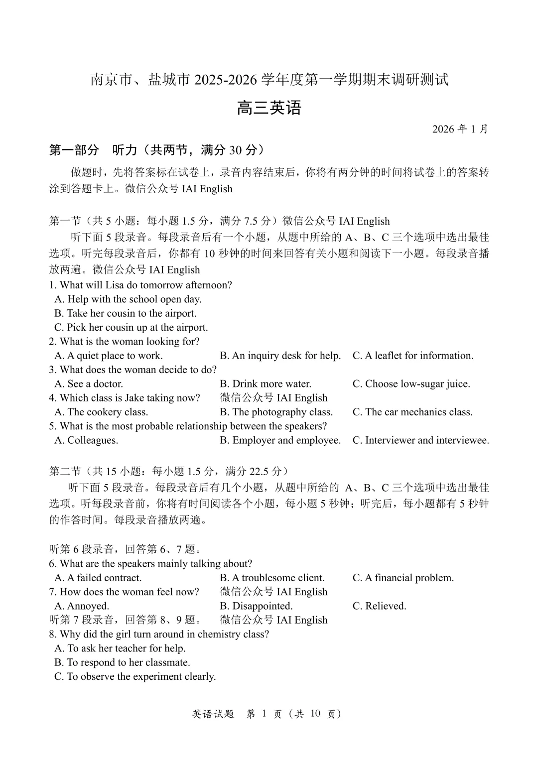 当前位置:首页>南京>南盐两地联考!南京市、盐城市2025-2026学年度第一学期期末调研测试高三英语试题+听力音频+答案+词汇整理