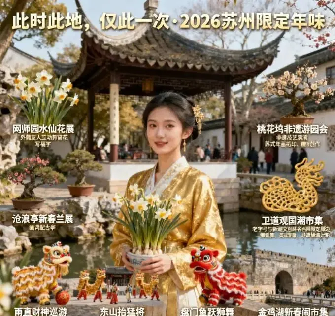 2026春节的苏州,把江南年俗的老味道与新创意揉成限定体验,在园林、古城、水乡的每一处角落,都藏着“仅此一次”的苏式年味,等你前来打卡珍藏。
