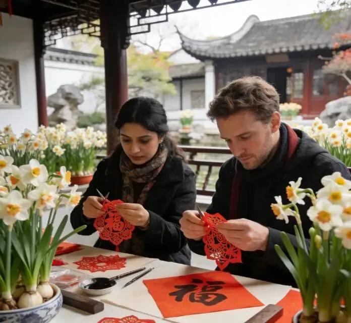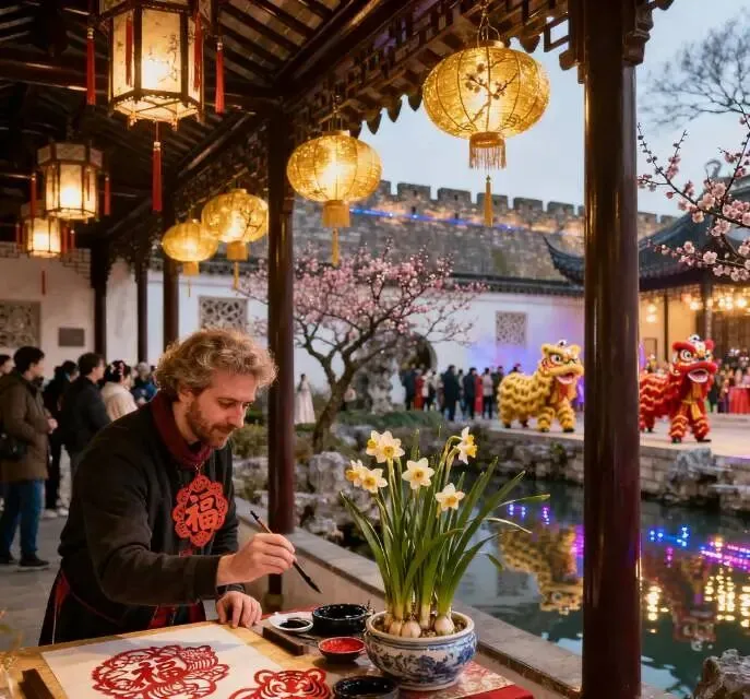 园林里的新春雅集是不可错过的限定体验。网师园的水仙花展恰逢国际日新春游园,一边赏百件水仙精品,一边可参与外籍友人同场的剪窗花、写福字互动,中西交融的年味仅此一回;狮子林的梅花联展串联诗词与盆景,点梅花妆、拓福印的沉浸式体验,是专属于2026新春的园林雅趣;沧浪亭的新春兰展迎寒绽放,幽兰配古亭的景致,唯有春节期间能得见这般雅致。