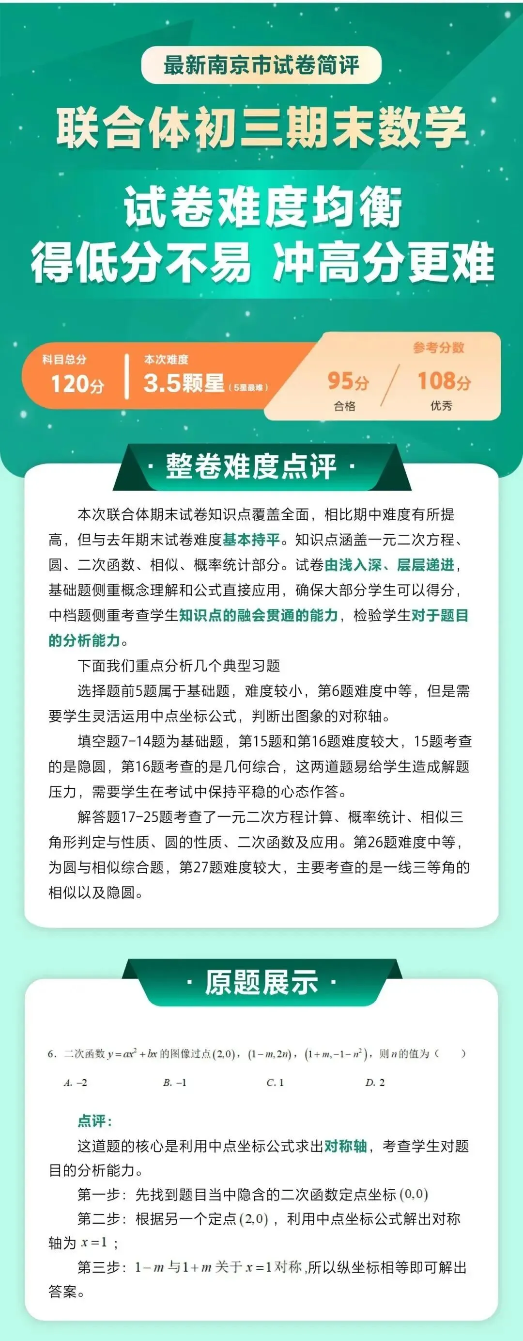 本次联合体期末试卷知识点覆盖全面,相比期中难度有所提高,但与去年期末试卷难度基本持平。知识点涵盖一元二次方程、圆、二次函数、相似、概率统计部分。