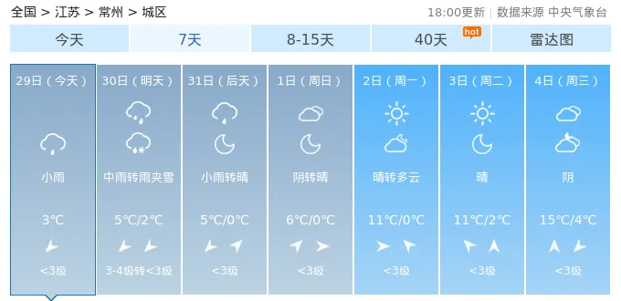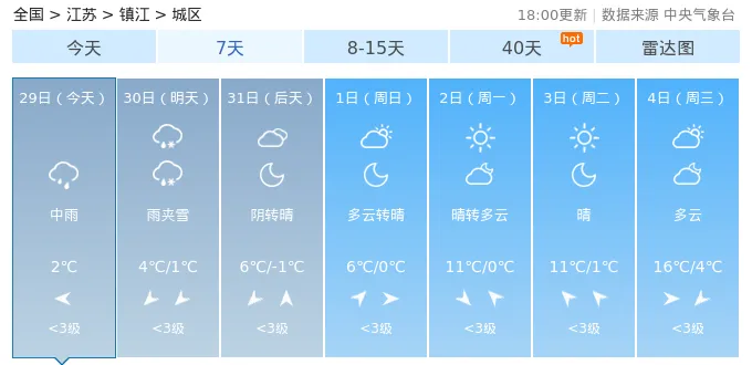 29日(今天):小雨,气温:3℃30日(明天):中雨转雨夹雪,气温:6℃/2℃31日(后天):小雨转阴,气温:4℃/0℃1日(周日):阴转多云,气温:6℃/0℃2日(周一):晴,气温:10℃/0℃3日(周二):晴,气温:11℃/2℃4日(周三):阴,气温:16℃/4℃