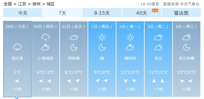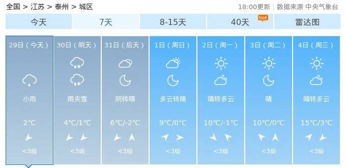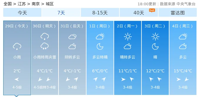 29日(今天):小雨,气温:2℃30日(明天):小雨转雨夹雪,气温:4℃/1℃31日(后天):阴转多云,气温:4℃/-1℃1日(周日):多云转晴,气温:6℃/0℃2日(周一):晴转多云,气温:11℃/1℃3日(周二):晴,气温:12℃/2℃4日(周三):多云,气温:15℃/4℃