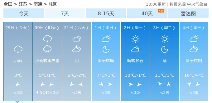 29日(今天):小雨,气温:3℃30日(明天):小雨转雨夹雪,气温:5℃/1℃31日(后天):阴,气温:6℃/-2℃1日(周日):多云转晴,气温:7℃/-1℃2日(周一):晴转多云,气温:10℃/-1℃3日(周二):晴,气温:11℃/1℃4日(周三):多云转阴,气温:16℃/4℃