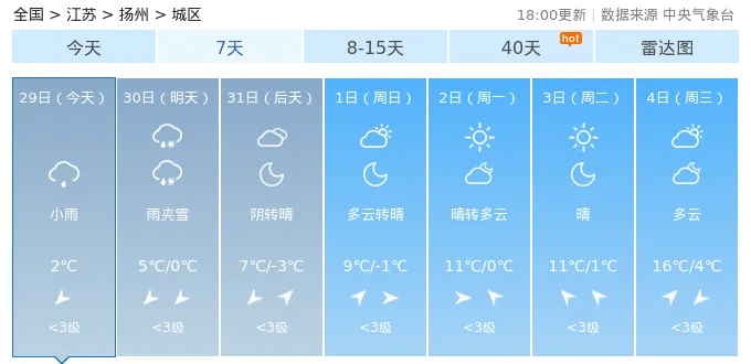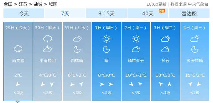 29日(今天):小雨,气温:2℃30日(明天):雨夹雪,气温:5℃/0℃31日(后天):阴转晴,气温:7℃/-3℃1日(周日):多云转晴,气温:9℃/-1℃2日(周一):晴转多云,气温:11℃/0℃3日(周二):晴,气温:11℃/1℃4日(周三):多云,气温:16℃/4℃