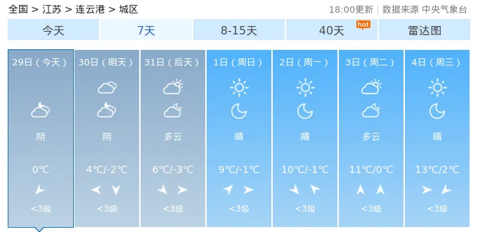 29日(今天):阴,气温:0℃30日(明天):阴,气温:4℃/-2℃31日(后天):多云,气温:6℃/-3℃1日(周日):晴,气温:9℃/-1℃2日(周一):晴,气温:10℃/-1℃3日(周二):多云,气温:11℃/0℃4日(周三):晴,气温:13℃/2℃