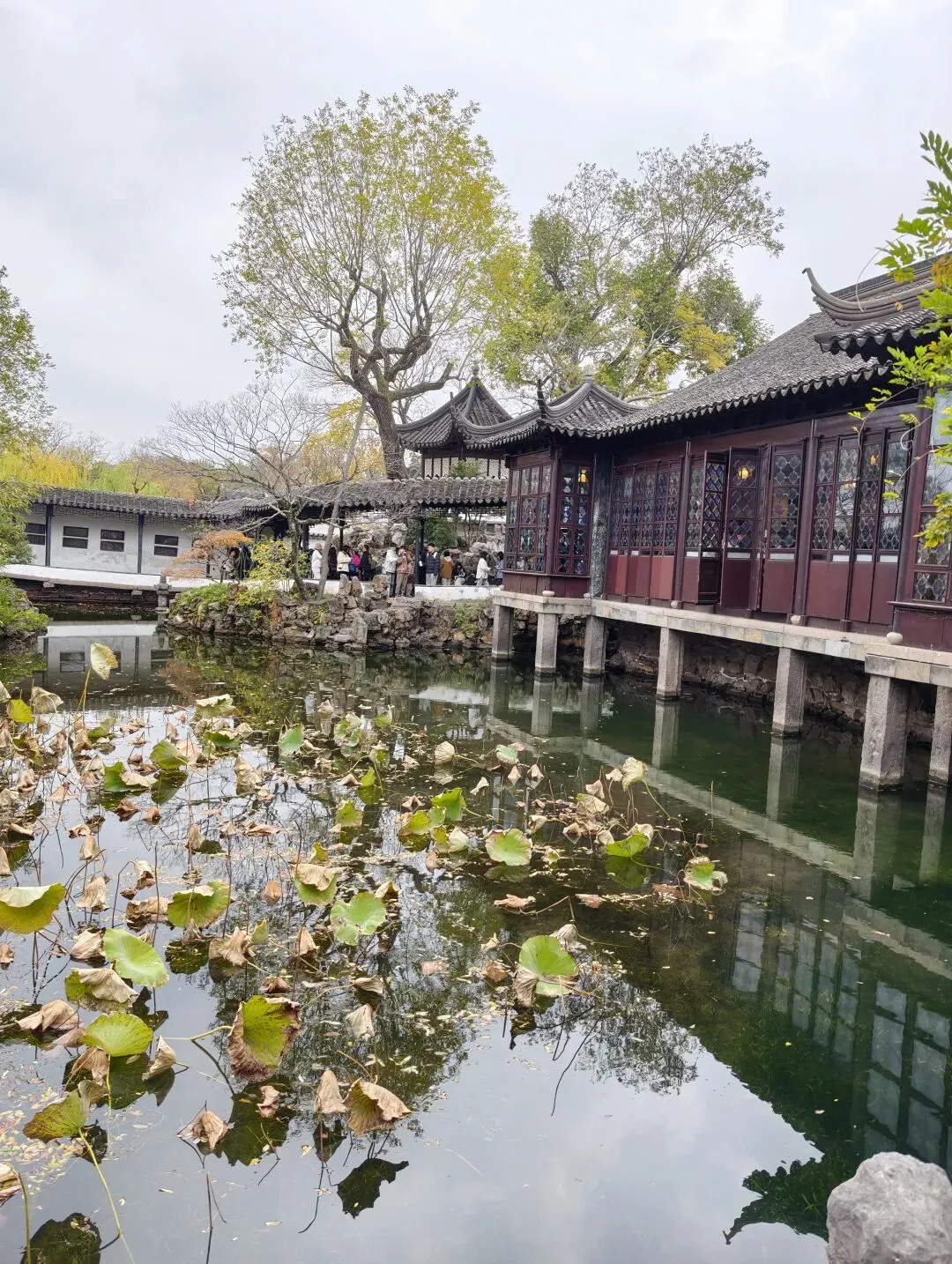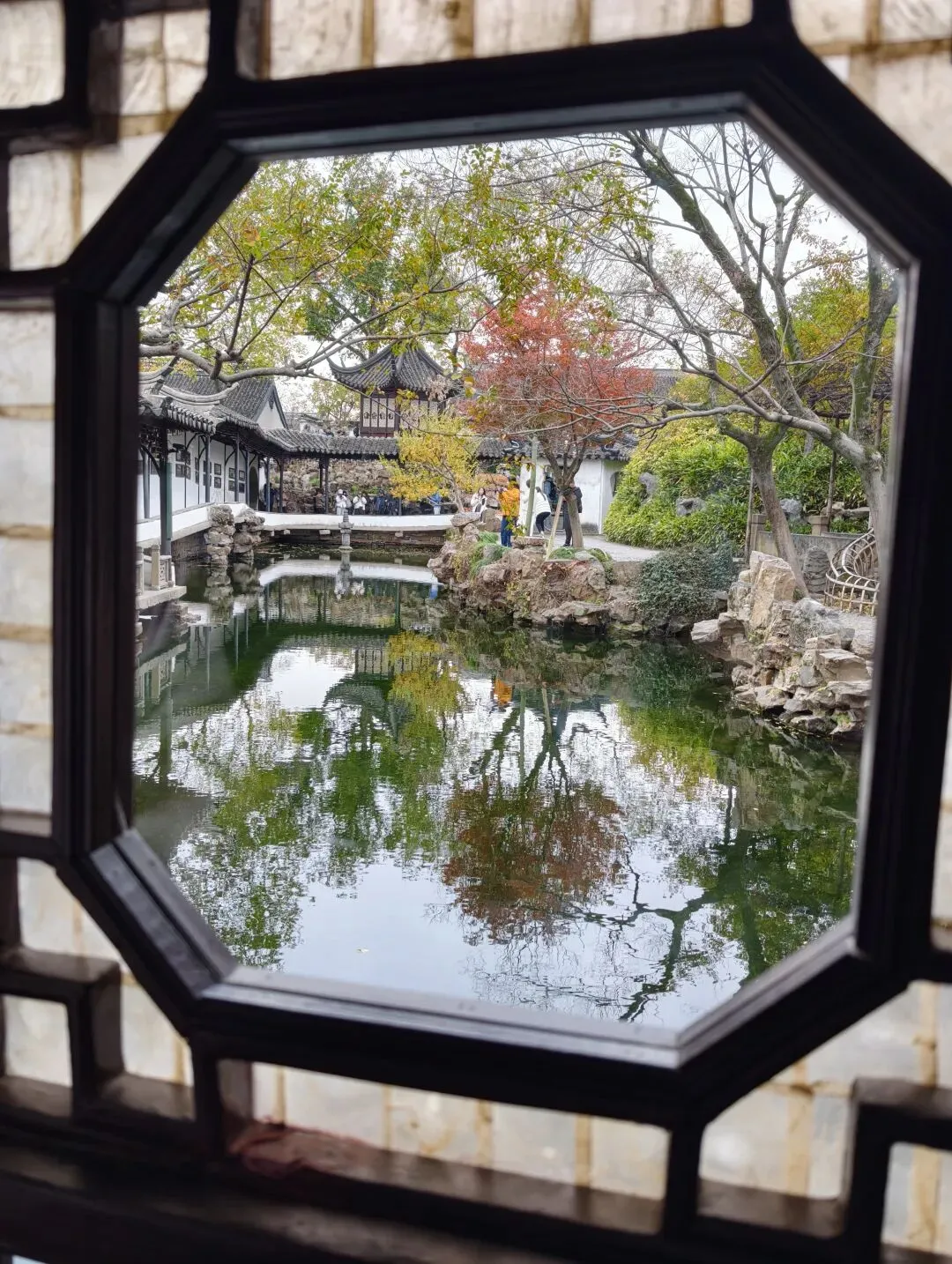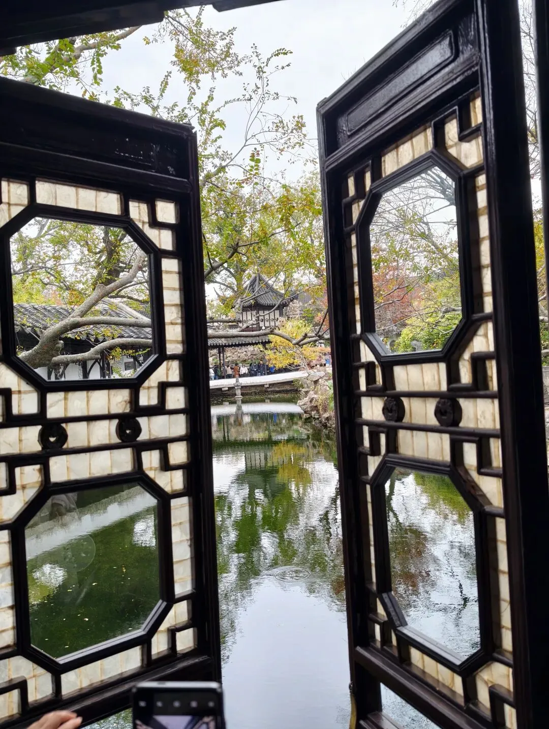 宜两亭作为拙政园内的珍贵古建,其独特的明瓦窗等构件是被特别保护的,每年仅开放一个月,为了文物保护和人流控制。 可透过亭子里的梅花窗,去观赏和拍摄园子的景色,非常独特,所以排队者众多。