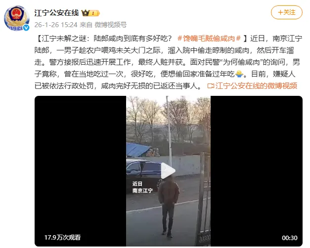 最近有个哭笑不得的新闻引起了网友的关注,据江宁公安在线发布的消息,近日在南京江宁陆郎镇,有一名男子趁着农户喂鸡没关门,溜进院子里偷走了正在晾制的咸肉,随后开车离开。警方接报后迅速展开工作,这位“咸肉手”很快被找到,在男子家中找到了丢失的咸肉,面对民警“为何偷咸肉”的询问,男子回复说之前在陆郎吃过一次,太好吃了所以想要带回家过年吃。目前该男子被依法行政处罚,咸肉还给了当事人。