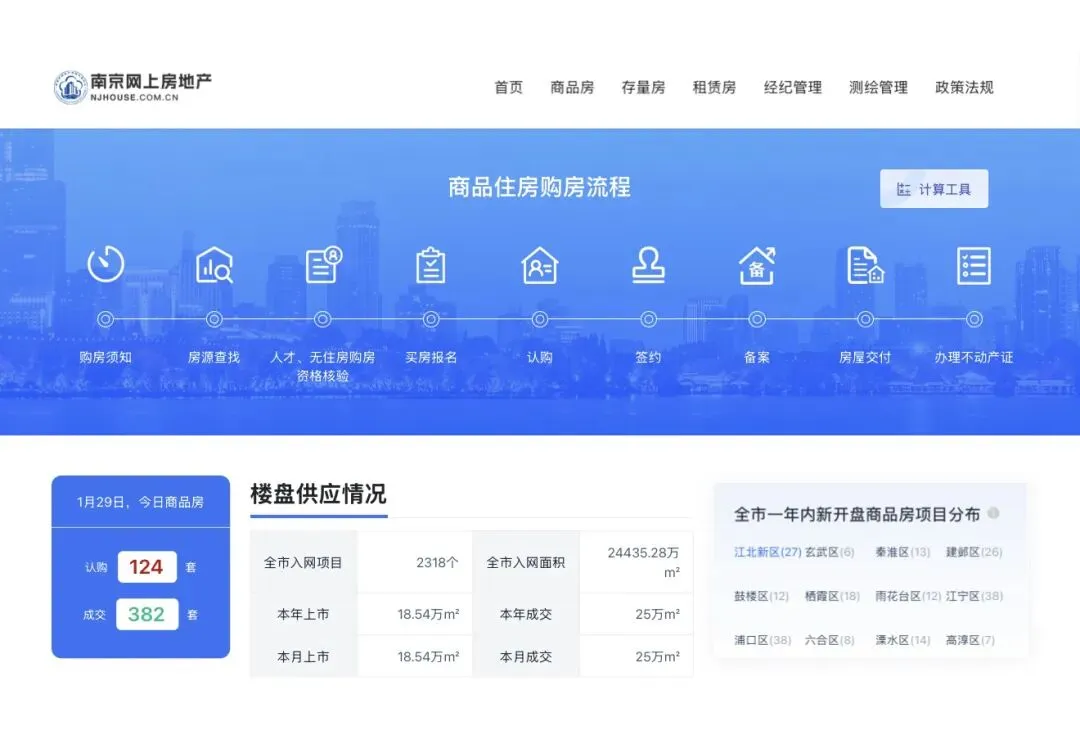 据南京网上房地产官方数据,截止到2026年1月29日,南京商品房认购124套,成交382套。