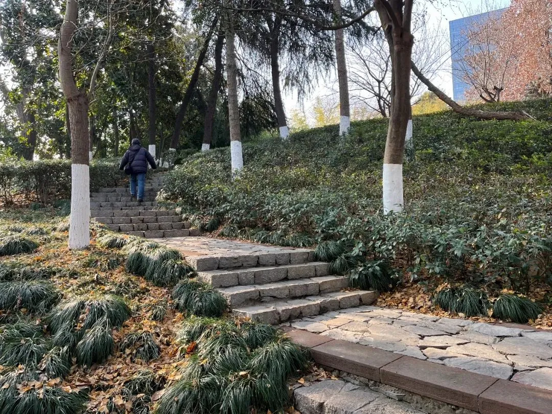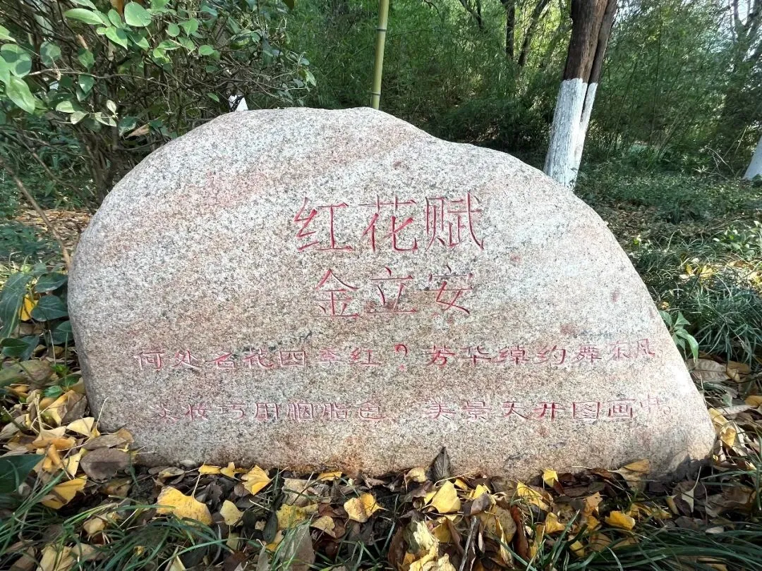 十分难得的是,遗址公园向阳一侧,从西向东匠心独运的依次设置了名人诗赋石雕,既自成一景,又与遗址内涵交相辉映。如:曹福华《金陵窨子山赋》、爱新觉罗.玄烨《赐江宁文武将士宴于教场》、孙立潭《大校场》、金立安《红花赋》。因诗人金立安曾是我法律职业同仁,他业务精湛、才华横溢,是我敬重的老朋友。每次散步到此,我都会倍感亲切的吟诵他的这首《红花赋》:“何处名花四季红?芳华绰约舞东风。淡妆巧用胭脂色,美景天开图画中。”