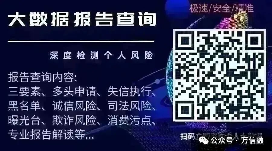 若自己一直申请贷款通过率低,尤其申请贷款经常不通过,可以微信扫码下面的二维码查看个人大数据情况。不查个人征信,不上征信,仅个人大数据情况。全国可查询,可以保存使用,及时了解大数据提升通过率。