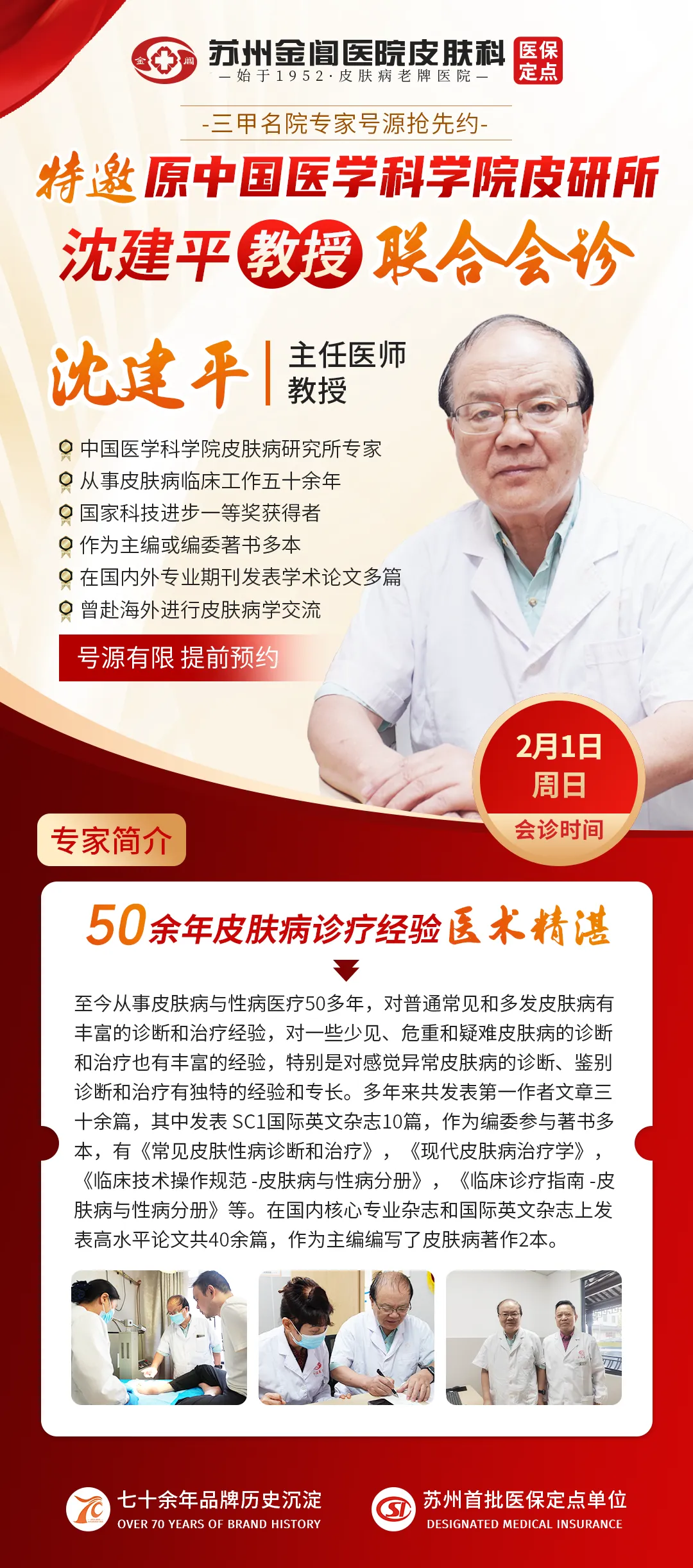 为满足皮肤疾病患者的诊疗需求,苏州金阊医院皮肤科特邀原中国医学科学院皮肤病研究所沈建平教授于2月1日(周日)莅临我院,与我院皮肤科上海专家卢国频教授、黄红军主任共同开展联合会诊。沈建平教授:来自中国医学科学院南京皮研所,在疑难、复杂皮肤病的诊疗领域拥有深厚造诣。平日里皮研所专家一号难求!