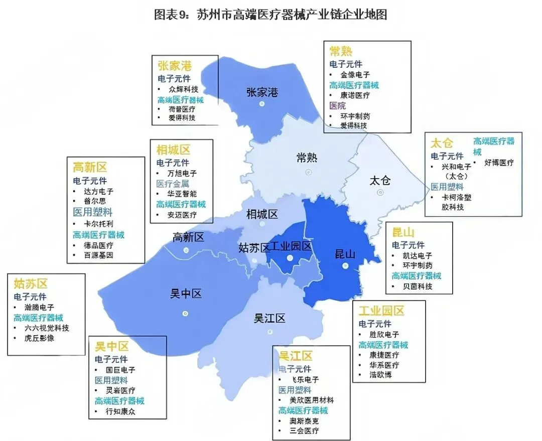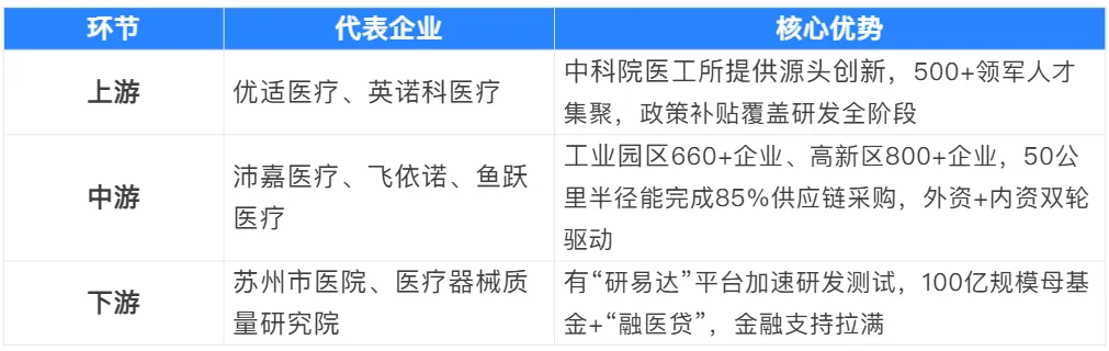 产业链韧性强劲:形成“上游材料零部件-中游设备耗材制造-下游医疗应用”完整链条,50公里半径内可完成85%供应链采购;上游有优适医疗、英诺科医疗等企业依托中科院医工所实现源头创新,中游聚集沛嘉医疗、飞依诺等领军企业,下游联动苏州市医院、医疗器械质量研究院形成闭环。