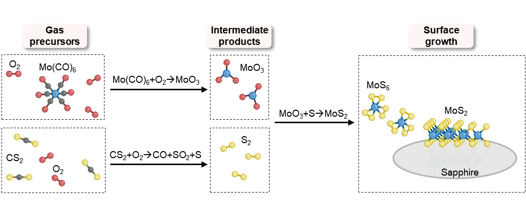 针对上述难题,团队提出全新解决方案:首次采用无氢、低碳的二硫化碳(CS2)作为硫源,从源头减少杂质引入。进一步开发oxy-MOCVD技术,通过引入氧气,在高温下与前驱体充分预反应,生成高纯度和高活性反应中间体,实现了生长动力学的精准调控。相比传统反应路径,反应能垒从2.02 eV降至1.15 eV,显著提升反应动力学速率;同时从根源上抑制含碳中间体的形成,避免碳污染,为大面积、高质量、高均匀性MoS2的外延生长筑牢根基。
