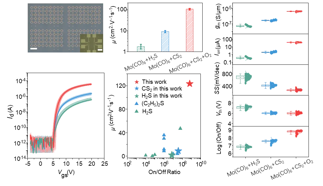 为了验证oxy-MOCVD技术的产业化潜力,团队制备了6英寸MoS2单晶晶圆,表征结果证明晶圆范围内材料质量与均匀性保持超高水准。团队利用人工智能图像识别技术对6英寸范围光学显微镜视频进行晶畴取向实时分析,结果显示单向取向比例接近100%。基于MoS2制备的场效应晶体管,室温迁移率平均达到101.3 cm2·V-1·s-1,最高达到122.9 cm2·V-1·s-1,开关比达109,刷新了产业化技术制备的二维半导体性能纪录,实现了实验室高质量材料与工业级规模化制备的完美融合。