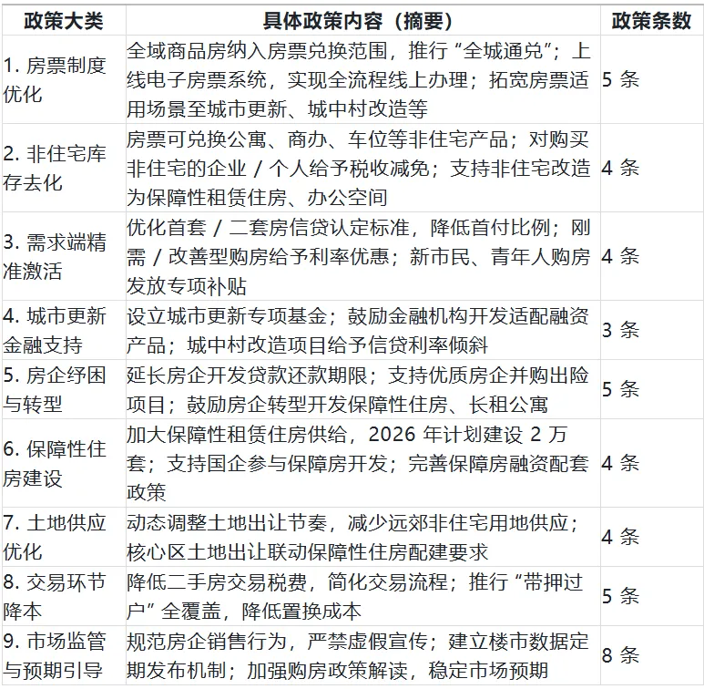 此次新政以 “精准施策、标本兼治” 为核心,42 条措施覆盖 “需求激活、库存去化、供给优化、金融支持、民生保障” 全链条,呈现三大特征:一是聚焦结构性去库存,将房票制度作为核心抓手,通过 “全城通兑” 打破区域壁垒,同时将非住宅纳入兑换范围,针对性解决远郊及商办产品积压问题,直击楼市供需失衡痛点;二是兼顾短期稳市场与长期建模式,短期通过信贷优惠、税费减免激活刚需和改善型需求,长期则通过土地供应优化、房企转型引导、保障房建设等,推动房地产从 “高周转” 向 “高质量” 转型;三是强化政策协同性,9 个大类政策相互衔接,如城市更新金融支持与房票制度联动,保障房建设与房企转型结合,既解决当下库存问题,又为培育新质生产力腾出空间。此外,政策注重民生导向,电子房票、“带押过户” 等举措简化办事流程,新市民购房补贴、保障房建设等则聚焦民生福祉,体现 “房住不炒” 定位下的民生温度。
