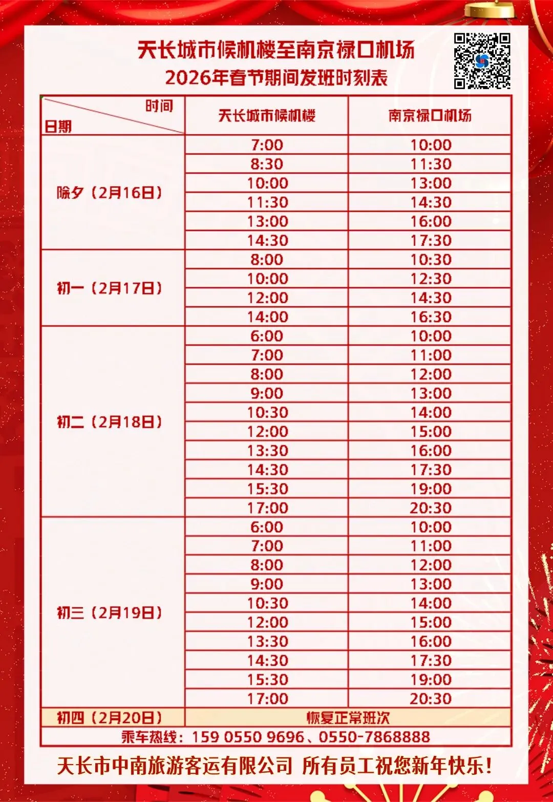 『天长至南京』2026年春节发班时刻表