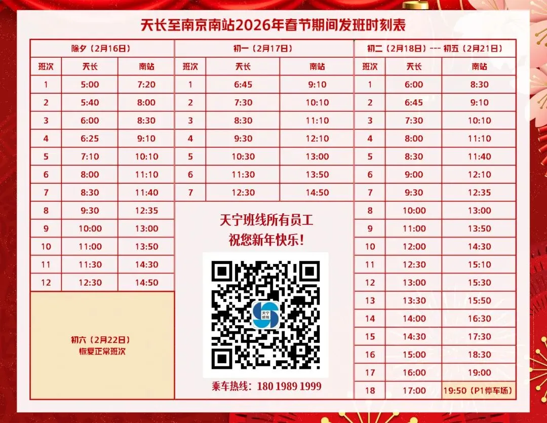 >『天长至南京』2026年春节发班时刻表