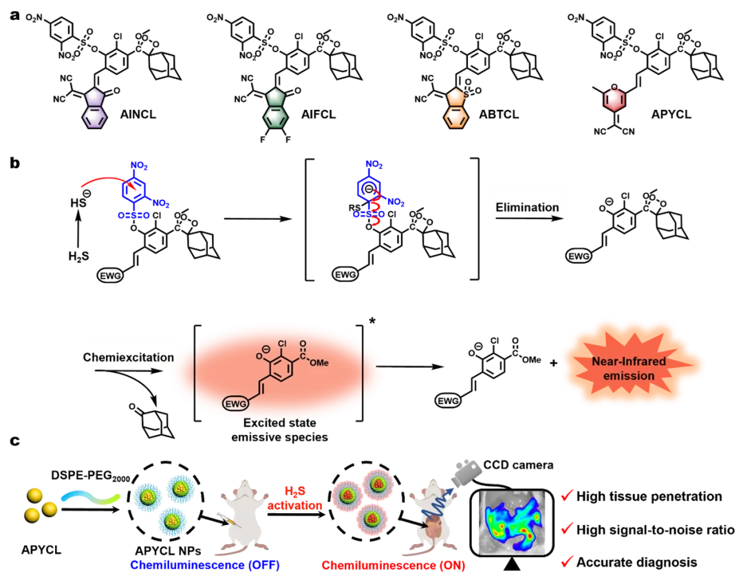 本工作通过分别引入不同的电子受体,对化学发光体的结构进行精细调控,成功合成了四种直接近红外发射的 Schaap’s 化学发光体(AINCL、AIFCL、ABTCL 和 APYCL)。这些吸电子基团具有不同的吸电子能力,为化学发光体带来了多样化的发射特性,也为后续的筛选和优化提供了丰富的选择。随后,利用硫化氢(H2S)可裂解的 2,4 -二硝基苯磺酸酯对酚基进行“笼化”修饰,成功实现了化学发光体对H2S的特异性激活。这种设计使得化学发光体在遇到内源性H2S时,能够迅速做出响应,开启化学发光过程。为满足生物应用需求,以DSPE-PEG2000将直接化学发光分子分别包封为纳米粒子(NPs),其中APYCL NPs兼具最长的发射波长(706 nm)、优异的H2S特异性检测效果、可接受的发射强度和发光半衰期。在炎症性肠病(IBD)和荷瘤小鼠模型中,APYCL NPs 能够被炎症和肿瘤部位的内源性H2S高效、特异性激活,产生强烈且持久的化学发光信号,清晰地显示出炎症和肿瘤位置,而荧光成像则因背景干扰难以准确识别病灶部位。在腹膜转移瘤小鼠模型中,APYCL NPs 同样能够清晰地标记出肿瘤组织,为手术切除提供了精确指导。(图1)
