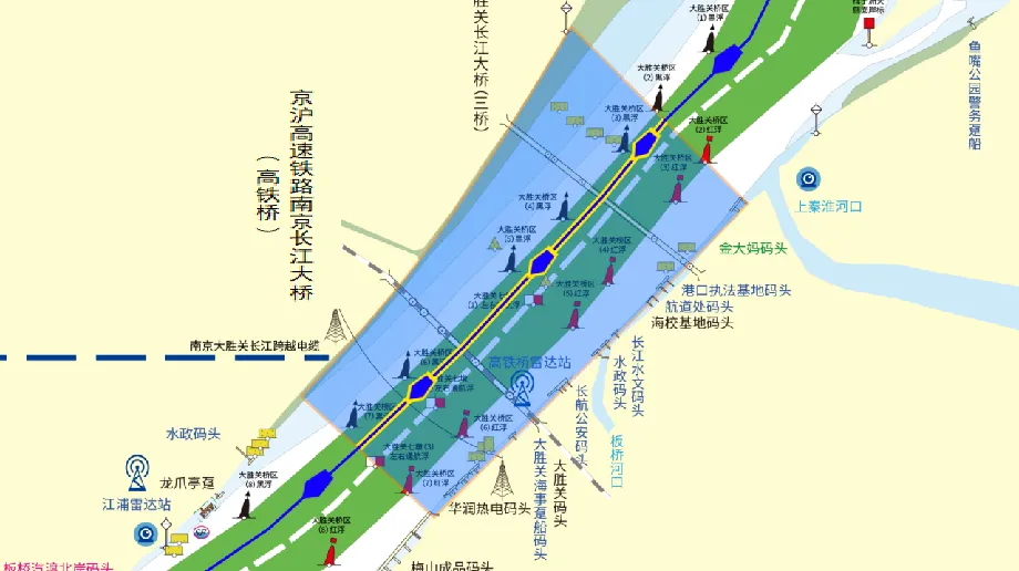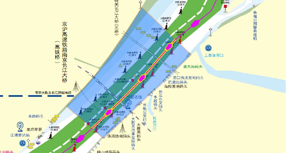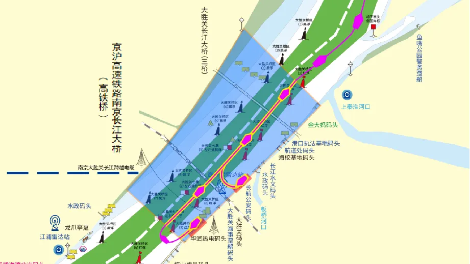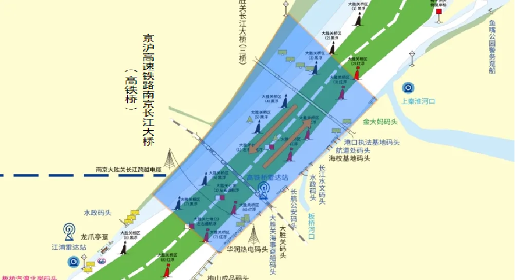 京沪高速铁路南京长江大桥与南京大胜关长江大桥统一设置桥区水域。桥区水域范围为京沪高速铁路南京长江大桥桥轴线上游1000米至南京大胜关长江大桥桥轴线下游500米左右两岸联线之间的水域。