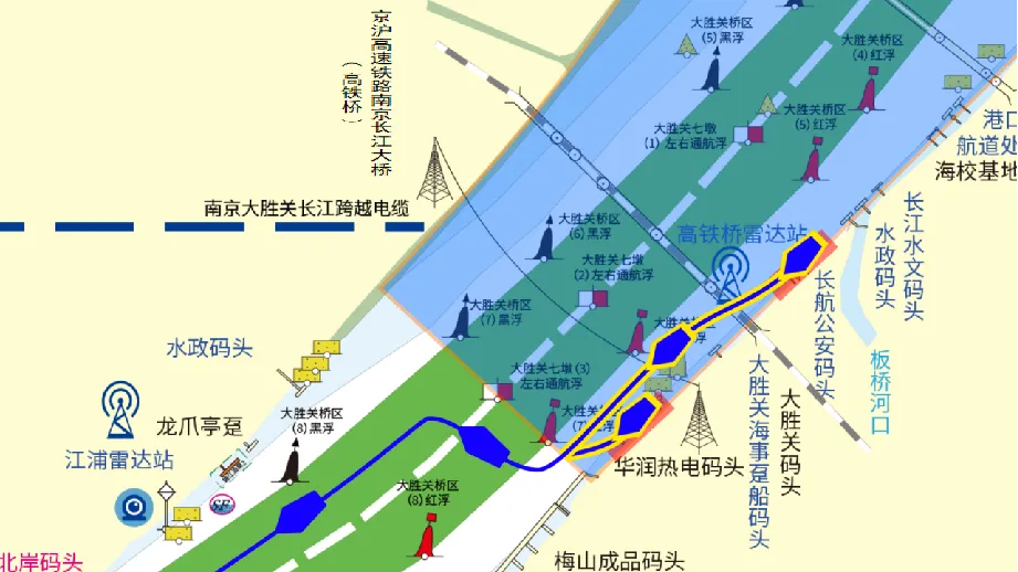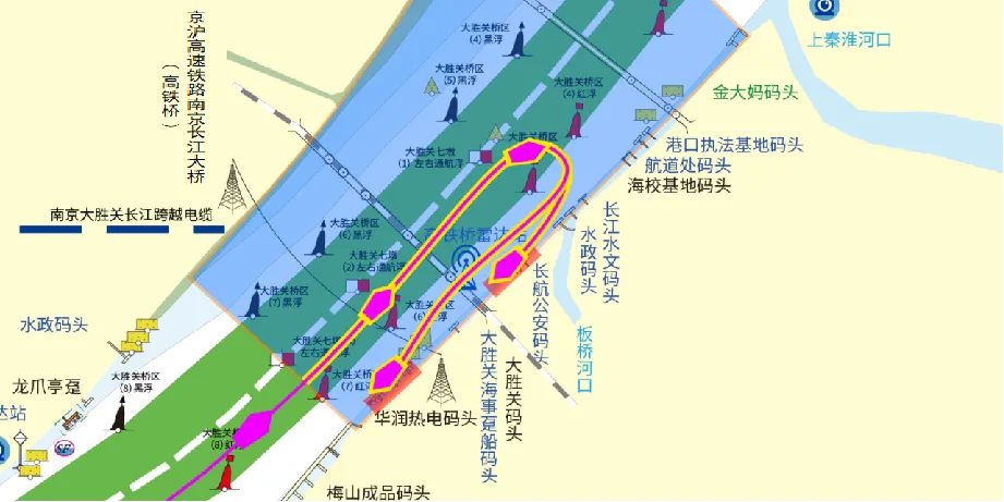 下游来船:下游来船过#148黑浮后,择机横越航道,通过桥区#2红浮进入桥区水域后,上行靠泊大胜关码头或华润热电厂码头。