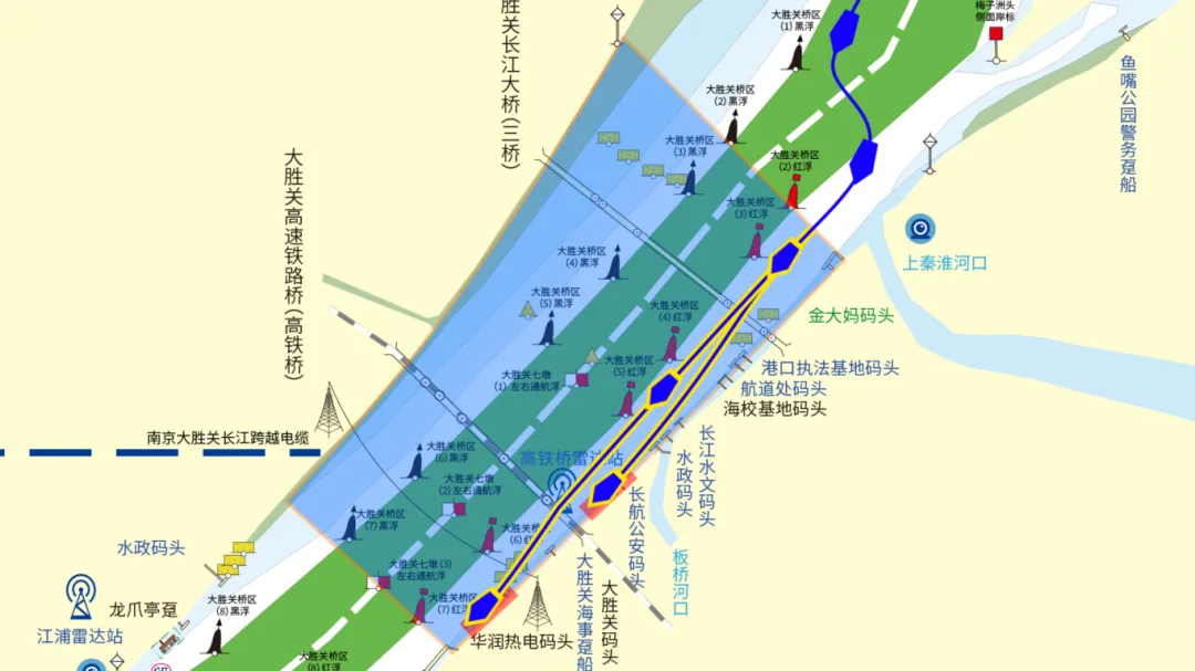 离泊上行:离泊大胜关码头和华润热电厂码头船舶,上行过桥区#7红浮后,择机横越航道进入上行通航分道上行。