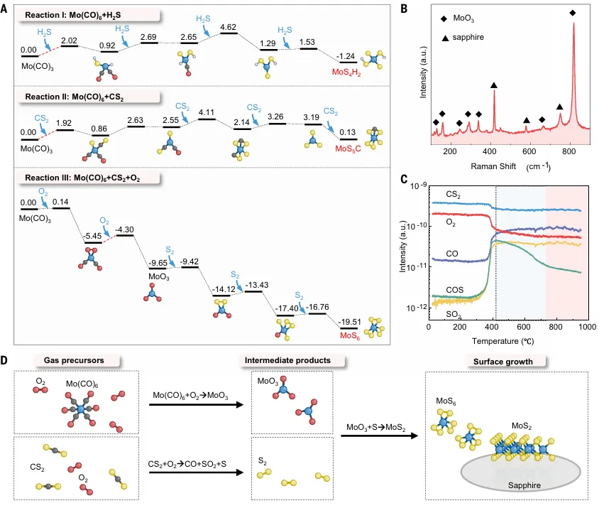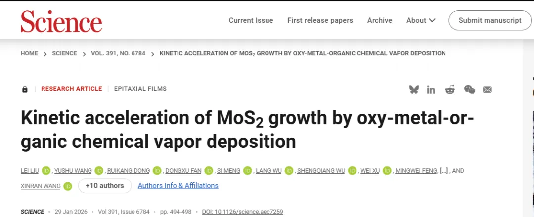 Lei Liu†, Yushu Wang†, Ruikang Dong†, Dongxu Fan†, Si Meng, Lang Wu, Shengqiang Wu, Wei Xu, Mingwei Feng, Ningmu Zou, Qingyu Yan, Zehua Hu, Fei Lu, Shitong Zhu, Yuan Gao, Liang Ma, Yi Shi, Taotao Li*, Jinlan Wang*, Xinran Wang* ,Kinetic acceleration of MoS2 growth by oxy-metal-organic chemical vapor deposition, Science, https://www.science.org/doi/10.1126/science.aec7259