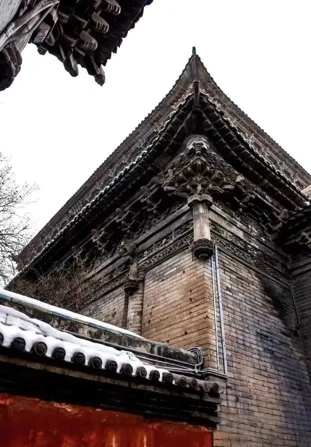 寺内主体建筑有大雄宝殿、三圣阁、禅堂、客堂等建筑,这里最令人惊叹的不是拱券结构,而是令人目不暇接、眼花缭乱的仿木砖雕。古人对于木构建筑形制的钟爱,在此体现得淋漓尽致:为达到砖石结构“形似于木,而工精于木”的效果,在殿宇正面的外墙有青砖磨砍砌出檐柱,平面呈圆形,半径敞露在外,做嵌入墙状;每根檐柱的下部还用青砖精心雕琢出仰覆莲须弥座。