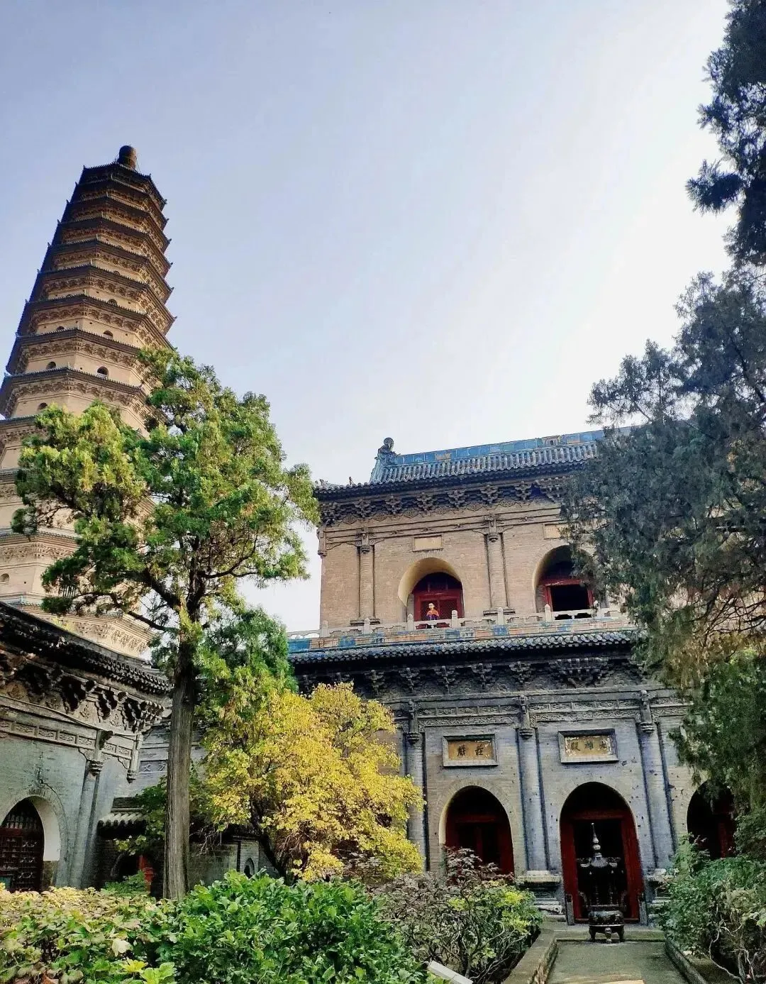 无梁殿大殿檐角与双塔同框,精美绝伦