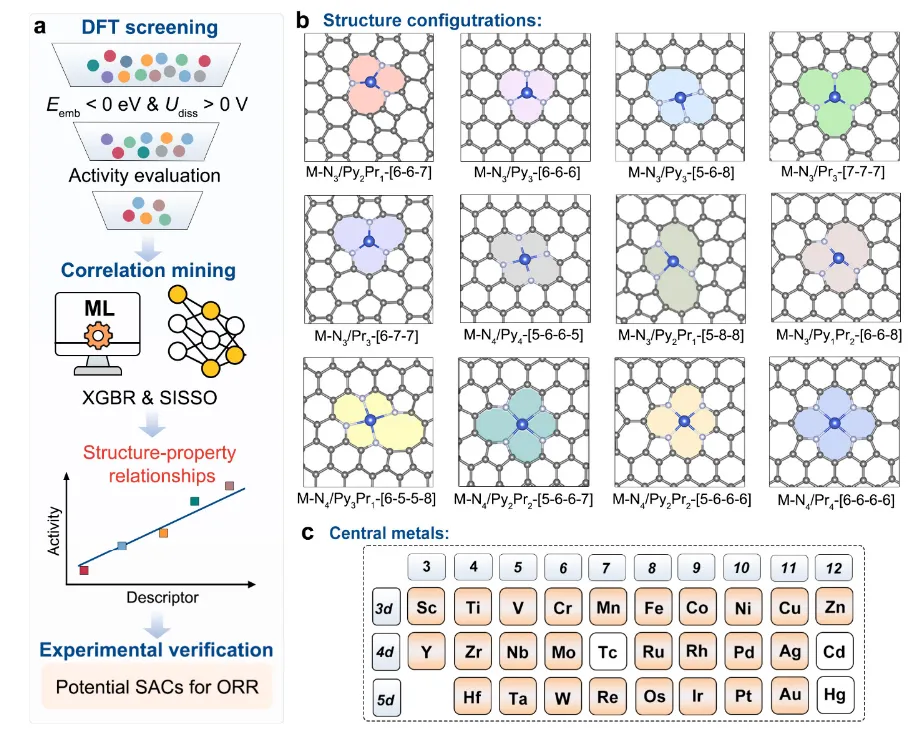 单原子催化剂(SACs)的局部配位结构与其催化性能间的定量构效关系长期缺乏普适性描述符,严重制约了其理性设计。本研究通过融合密度泛函理论(DFT)高通量筛选与机器学习(ML),系统解析了312种M–N–C SAC模型(涵盖26种过渡金属与12种配位构型)的氧还原反应(ORR)活性。数据挖掘揭示了一个低维可解释描述符 Eemb/ sin(CN),(emb为单原子嵌入能,CN为配位数),该描述符同时量化金属–载体相互作用强度与几何配位环境,能够统一描述不同金属中心的ORR活性趋势。基于此设计原则,通过缺陷工程策略精准合成富含吡咯型Cu–N3配位的催化剂,其半波电位达0.886 V(vs. RHE),超越商业Pt/C(0.872 V),锌空电池峰值功率密度达191.3 mW cm−2。该工作突破了SACs“黑箱式”设计瓶颈,建立了配位工程的普适性设计范式,为下一代电催化剂的理性开发提供了可迁移的方法论框架。