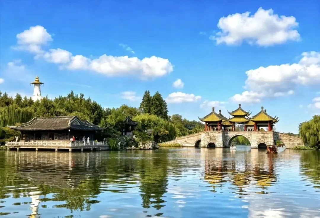 瘦西湖风景名胜区:是世界文化遗产大运河的重要组成部分、国家级风景名胜区蜀冈-瘦西湖风景名胜区的核心和精华部分。清代康乾时期即已形成的湖上园林群,融南方之秀、北方之雄于一体。窈窕曲折的一湖碧水,串以徐园、小金山、五亭桥、白塔、二十四桥、万花园、双峰云栈等名园胜迹,风韵独具而蜚声海内外。从隋唐开始,景区陆续建园,及至清代盛世,由于康熙、乾隆两代帝王的六次南巡 ,造就了“两岸花柳全依水,一路楼台直到山”的湖山盛况。历史上李白、杜牧、苏轼、朱自清等文化名人都很赞叹瘦西湖秀美的风光,留下众多脍炙人口的篇章。“烟花三月下扬州”、“绿杨城郭是扬州”等数不清的名言佳句,为瘦西湖增添了耀眼的浓墨重彩。“天下西湖,三十有六”,唯扬州的西湖,以其清秀婉丽的风姿独异诸湖。一泓曲水宛如锦带,如飘如拂,时放时收,较之杭州西湖,另有一种清瘦的神韵。