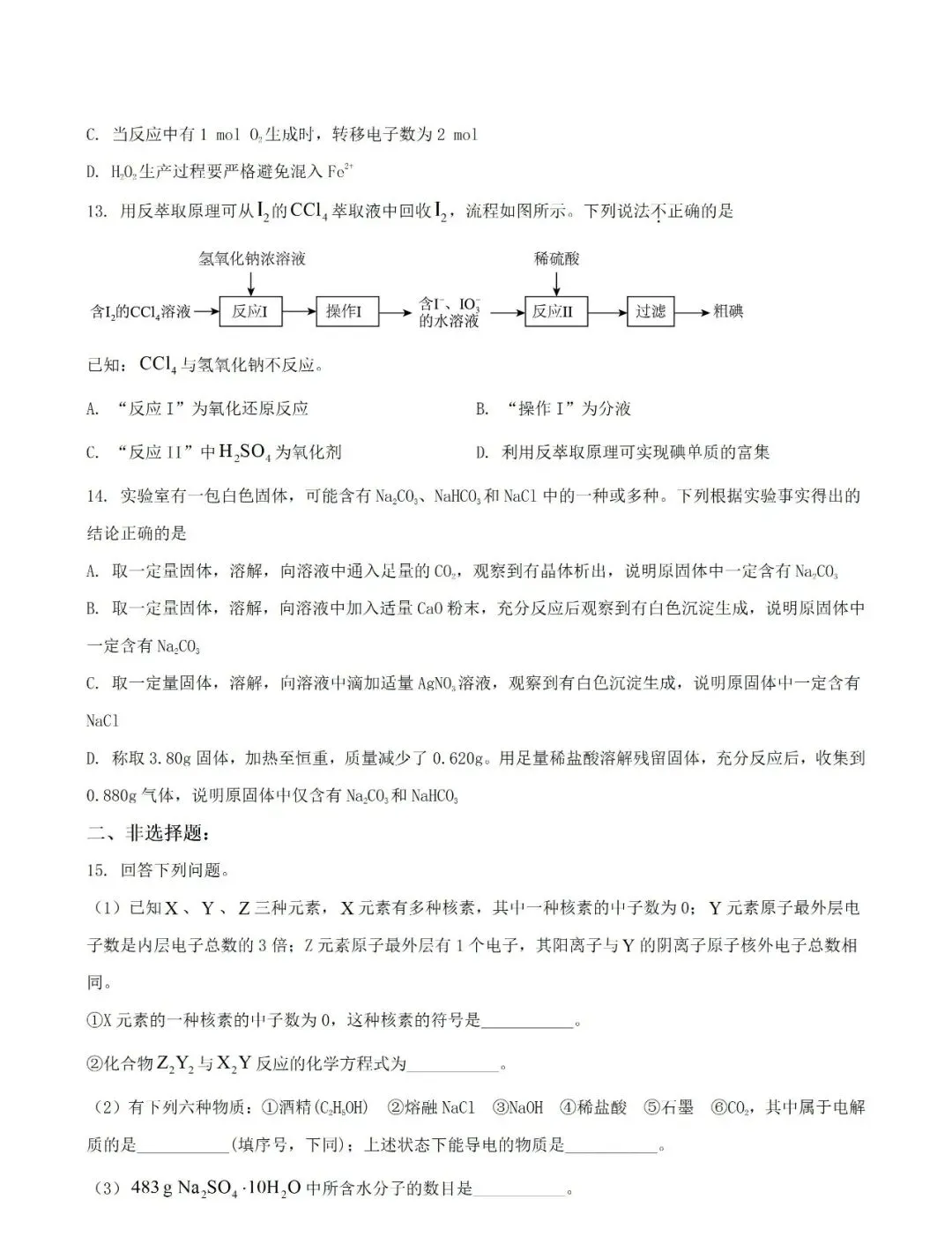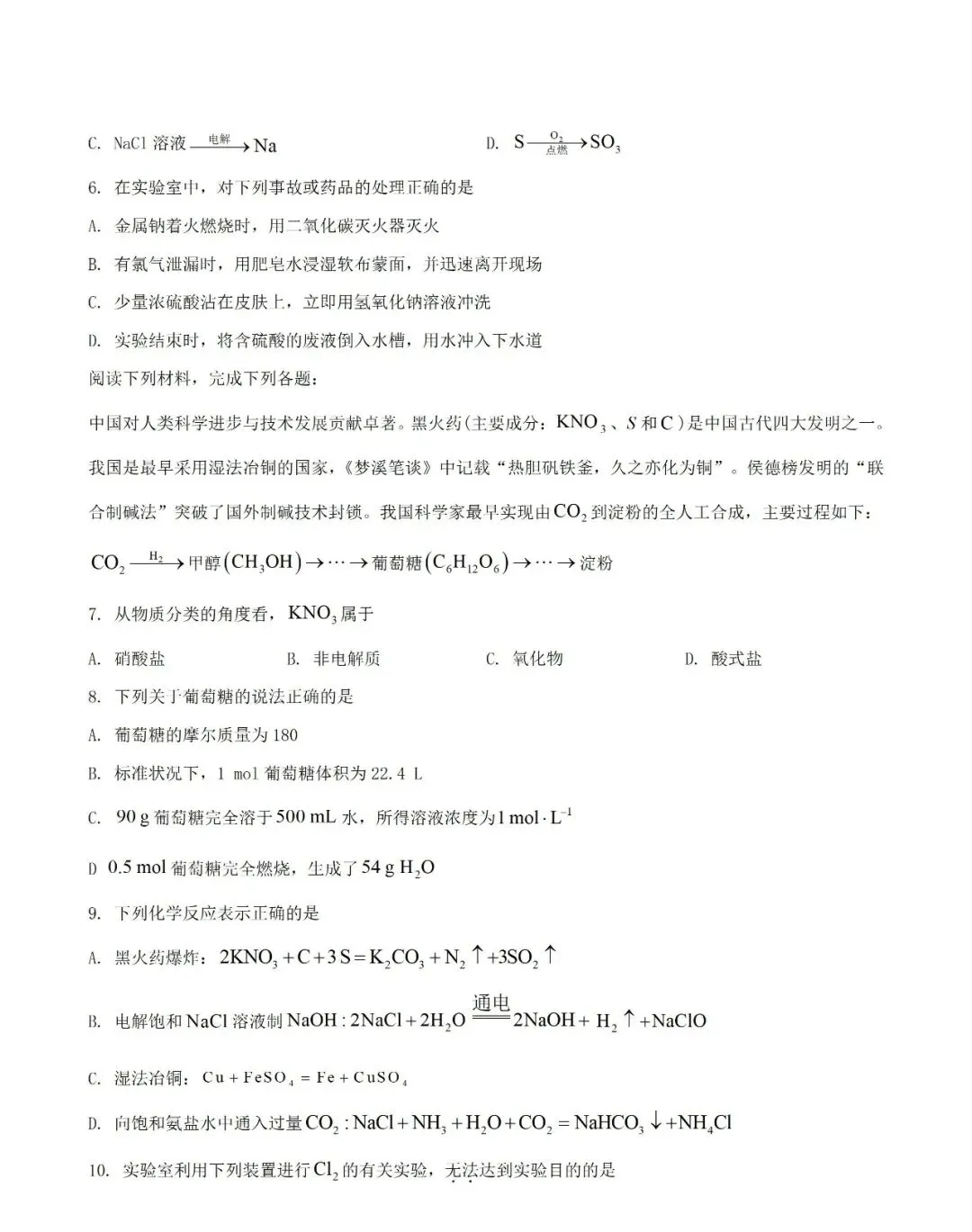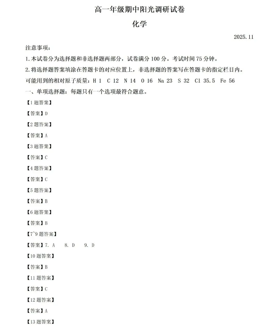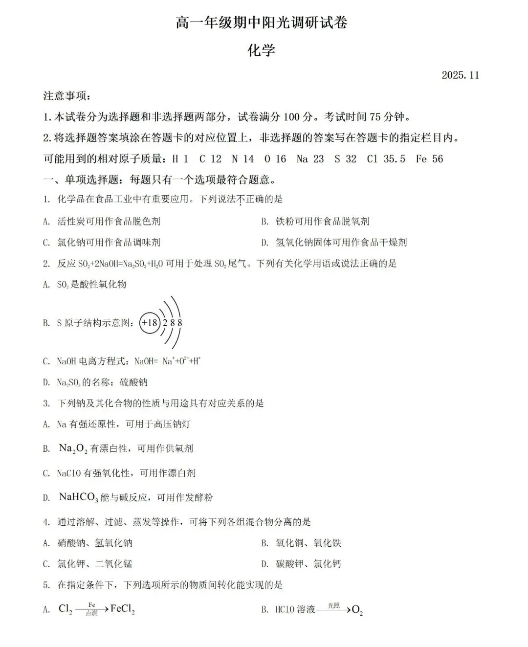 >苏州市2025-2026年学年高一上学期期中阳光调研化学试卷及答案