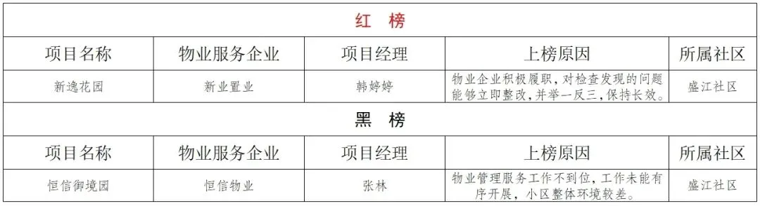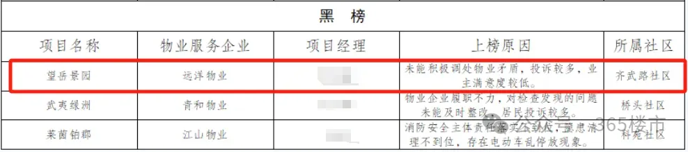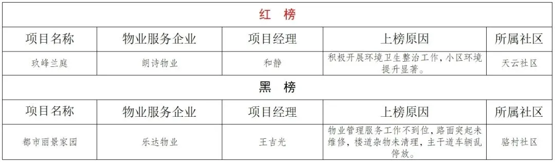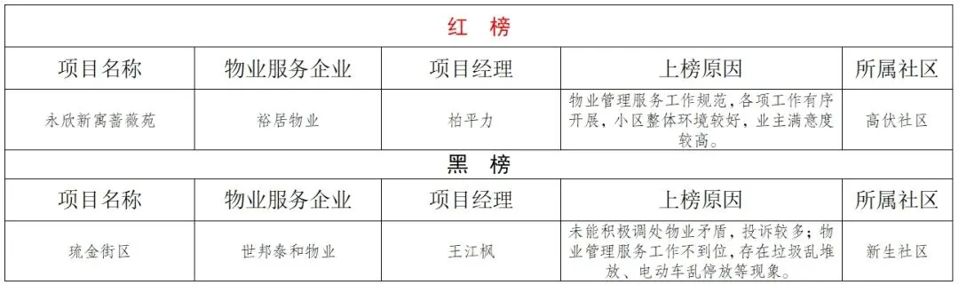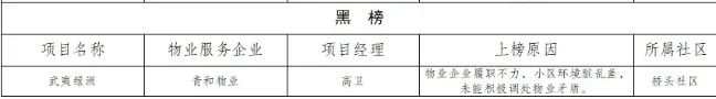 上黑榜的项目包括:乐达物业、龙润物业、顺诚物业、世邦泰和物业、永凯物业、恒信物业等。上榜原因主要包括小区环境差、维护不到位、小区物业矛盾多、业主投诉多,电动车乱停放、问题整改不及时等。