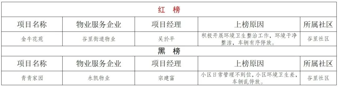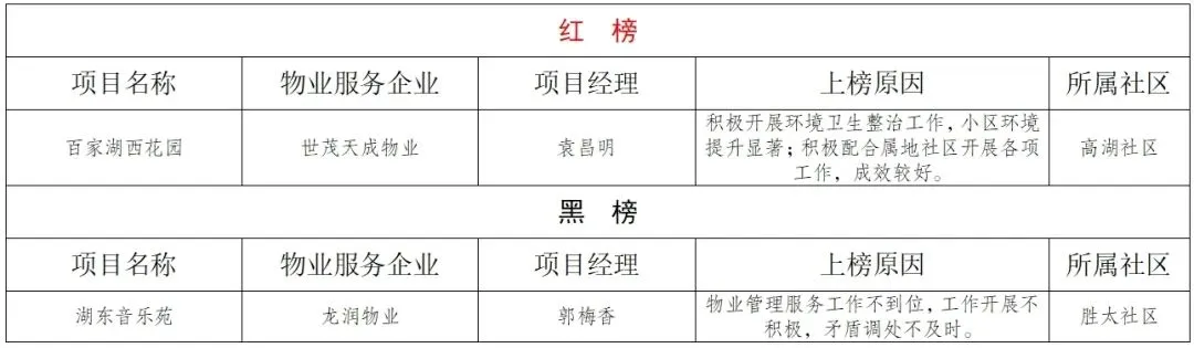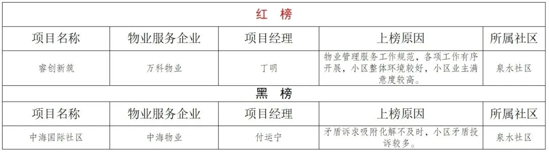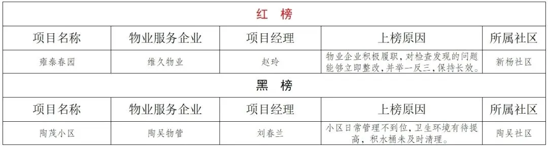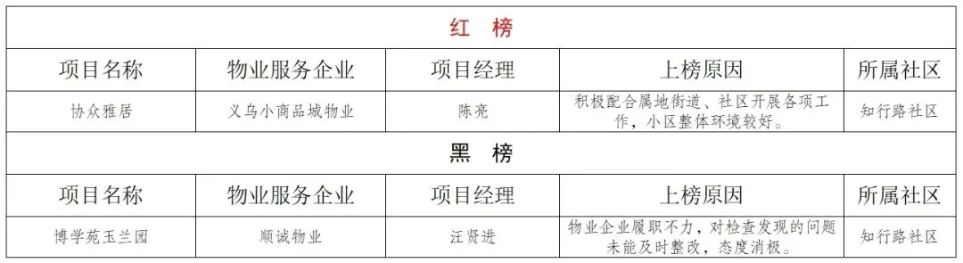 上红榜的项目:玖峰兰庭(朗诗物业)、百家湖西花园(世茂天成物业)、协众雅居(义乌小商品城物业)、睿创新筑(万科物业)、永欣新寓蔷薇苑(裕居物业)、金牛花苑(谷里街道物业)、雍泰春园(维久物业)、新逸花园(新业置业)。