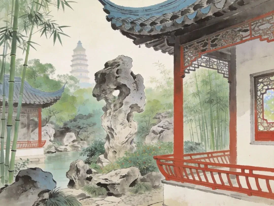 还有苏州的留园,它的西部有个「冠云峰」,本来就是个挺普通的太湖石,但造园家特意在它的对面修了个「可亭」,你站在可亭里看冠云峰,刚好能把远处的虎丘塔也框进画面里。这下好了,一块石头、一座塔、一个亭子,瞬间就组成了一幅层次分明的山水画,这就是「远借」的魔力。