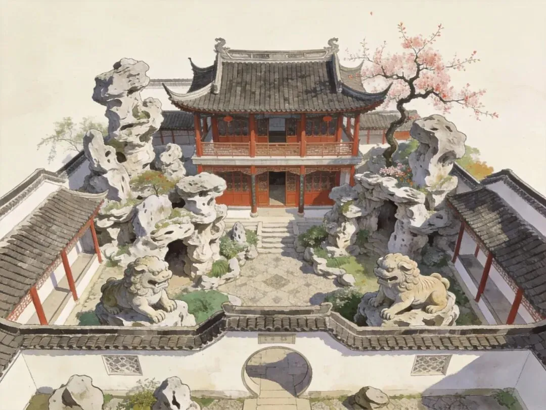 比如苏州狮子林的「问梅阁」,你站在阁上往下看,就能看到整个狮子林的假山群,那些奇形怪状的太湖石,就像一群狮子在园子里嬉戏,栩栩如生。这就相当于你在自己家的客厅装了个落地窗,往下就能看到自家的花园,那种掌控感,简直不要太好。