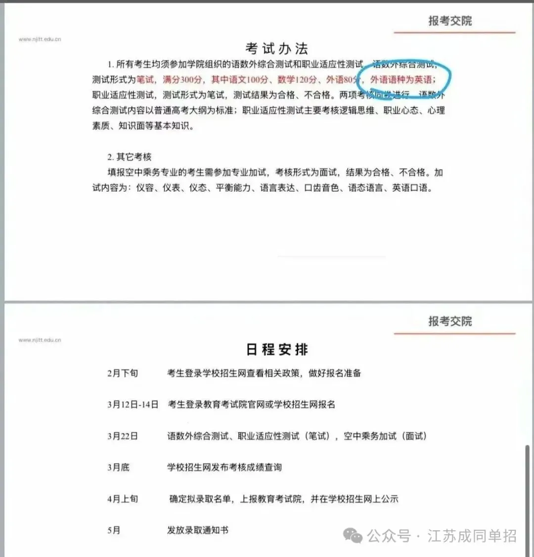 三、校考时间:1、3月22日语数外综合测试、职业适应性测试(笔试),空中乘务加试(面试)