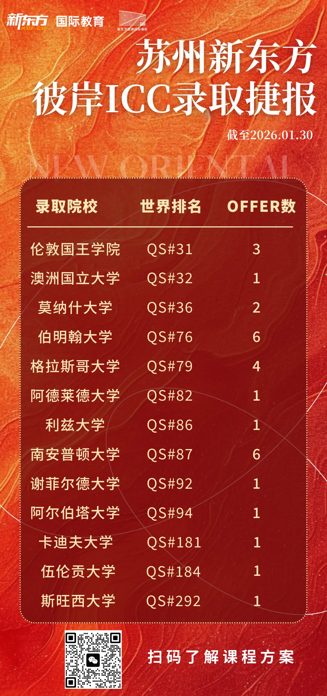 截至今日,苏州新东方彼岸ICC 2026届学子们已收获29封海外大学录取通知书!更多重磅录取正在路上,敬请期待!