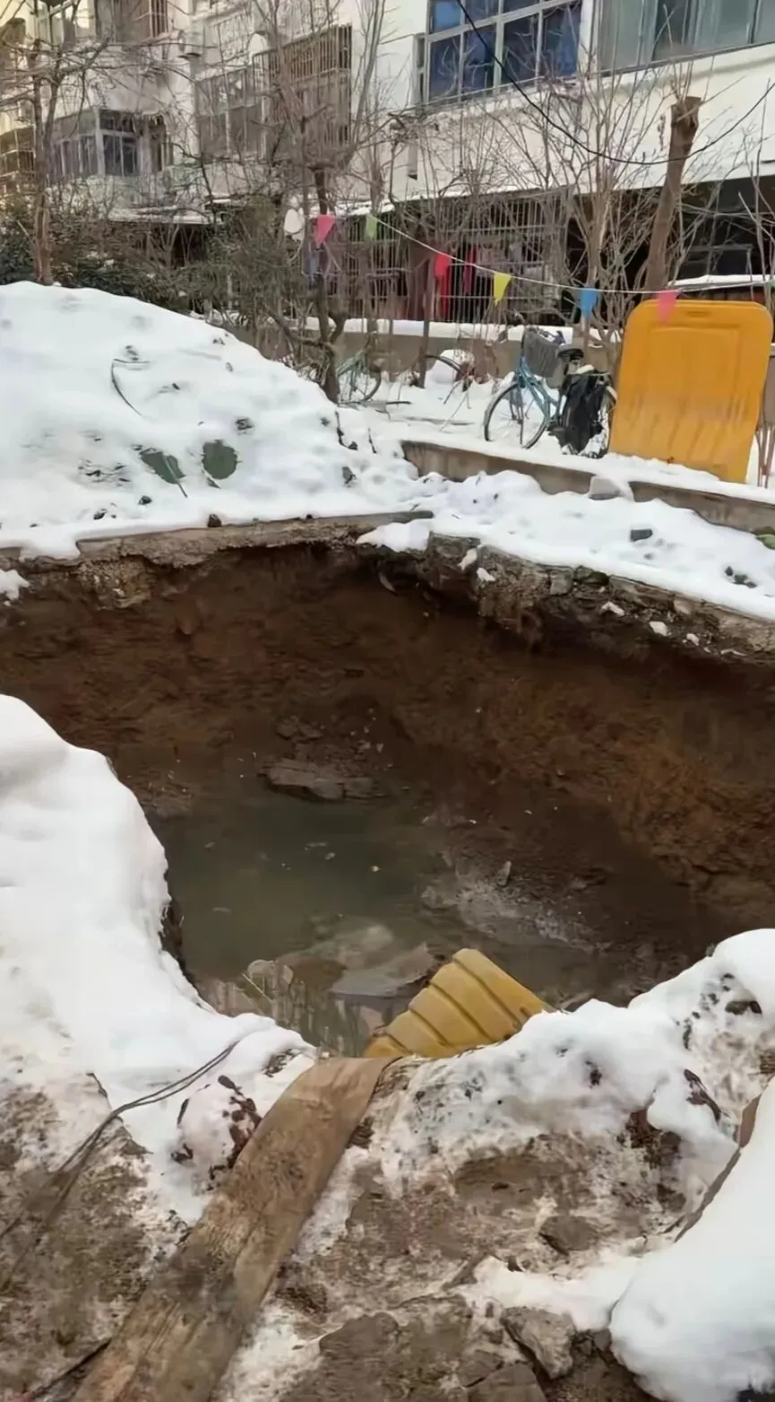 从图片上来看,这个坑洞还挺大的,呈现长方形形状,坑深几米。