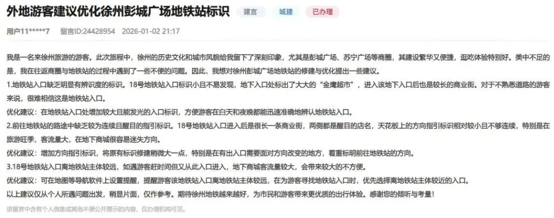 1月15日,徐州地铁集团有限公司回复称,拟在彭城广场站18号入口处设置相应标识,提升辨识度和指引效果;商业街内导向指引已完成方案设计,将与商场沟通后实施调整;同时还会在徐州地铁APP上添加相应的提示信息,方便乘客获取准确的出行指引。